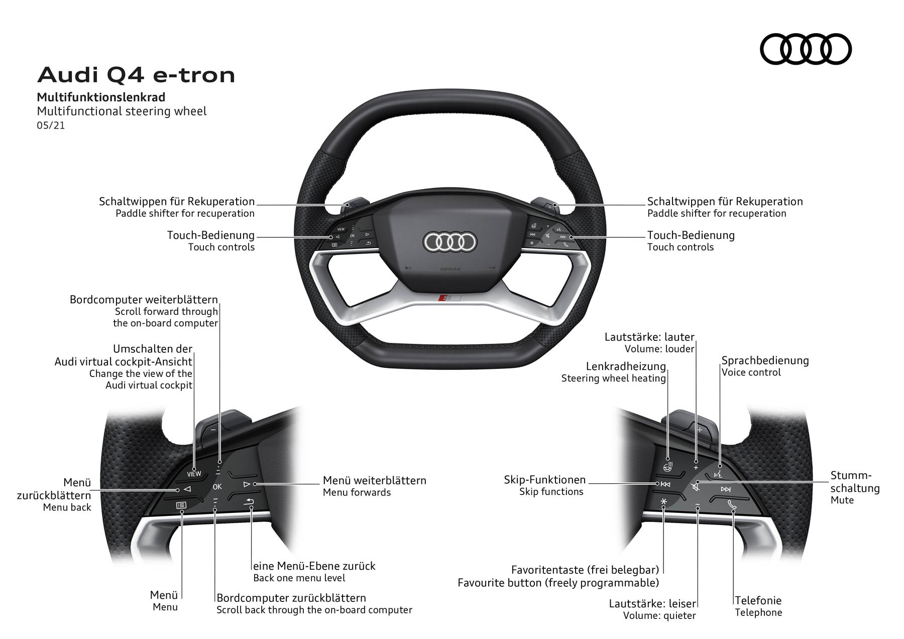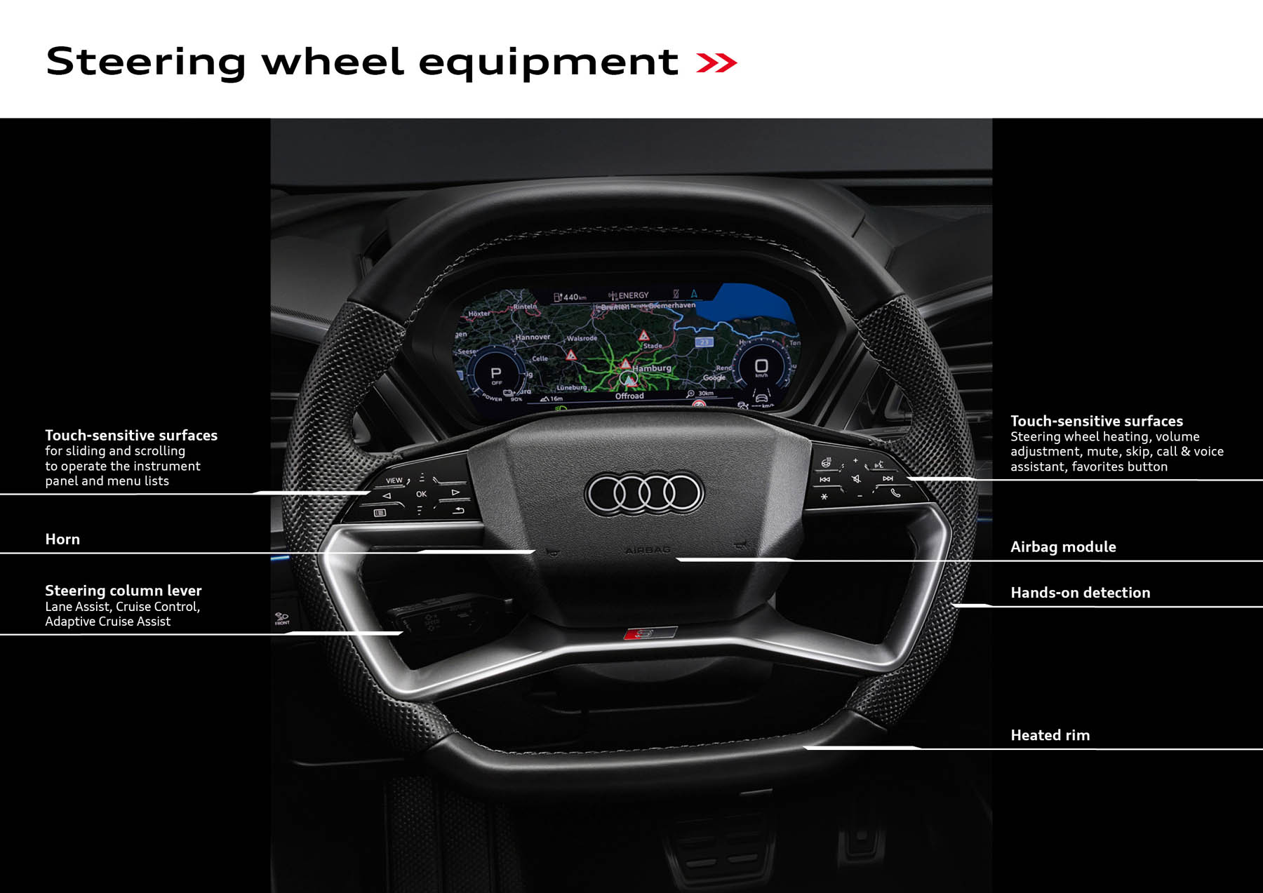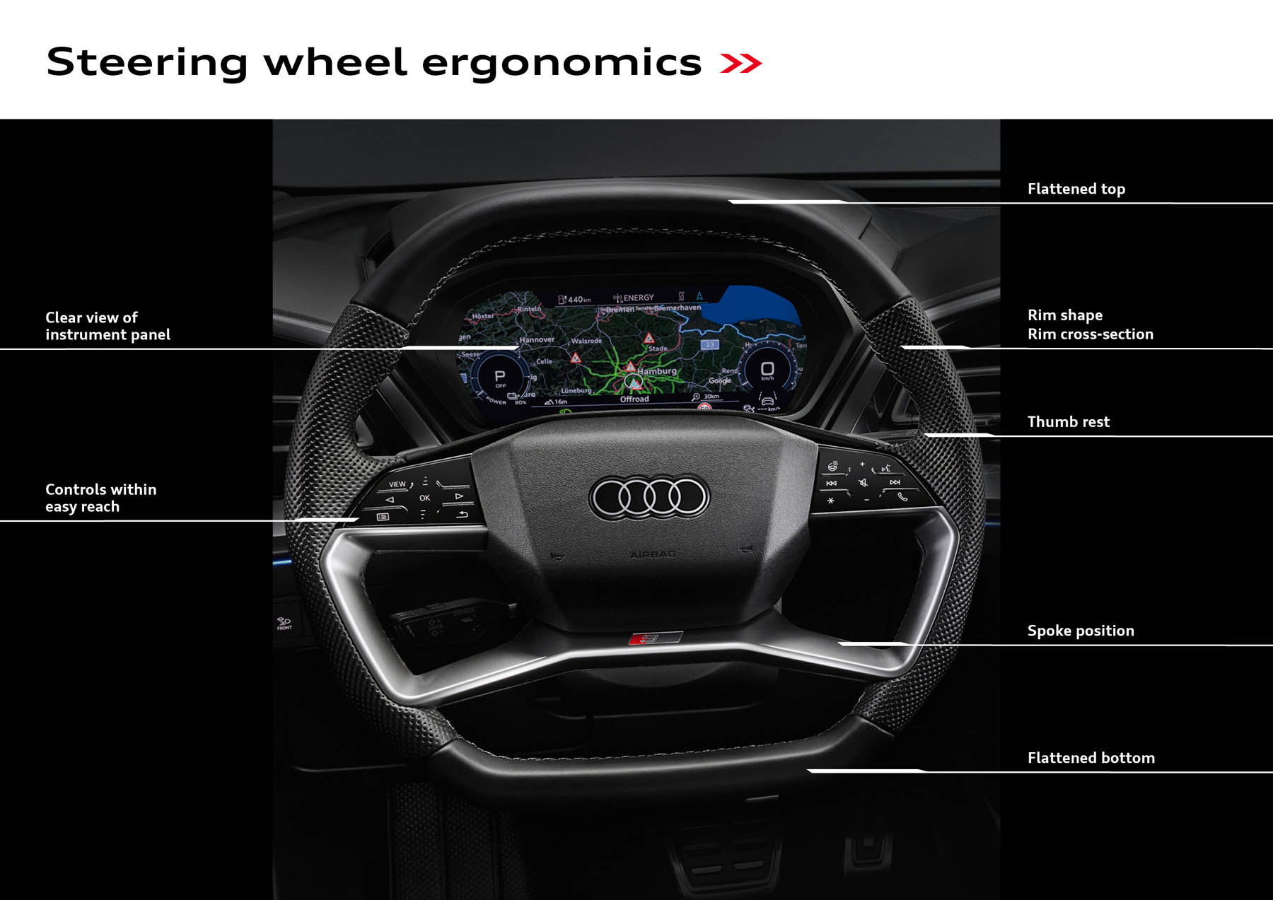 Ανεξάρτητα από την έννοια του οχήματος, πρέπει πάντα να διασφαλίζεται η προβολή όλων των οθονών. Σε όλα τα μοντέλα Audi, το ύψος και το βάθος του τιμονιού μπορούν να ρυθμιστούν στην περιοχή των +/- 30 χιλιοστών (1,18 ίντσες) έτσι ώστε κάθε οδηγός να μπορεί να βρει τη δική του κατάλληλη θέση καθίσματος. Σε γενικές γραμμές, πρέπει να υπάρχει απόσταση περίπου 25 έως 30 εκατοστών (9,84 έως 11,81 ίντσες) μεταξύ του άνω σώματος του οδηγού και του τιμονιού και οι βραχίονες του οδηγού πρέπει να κάμπτονται ελαφρώς.