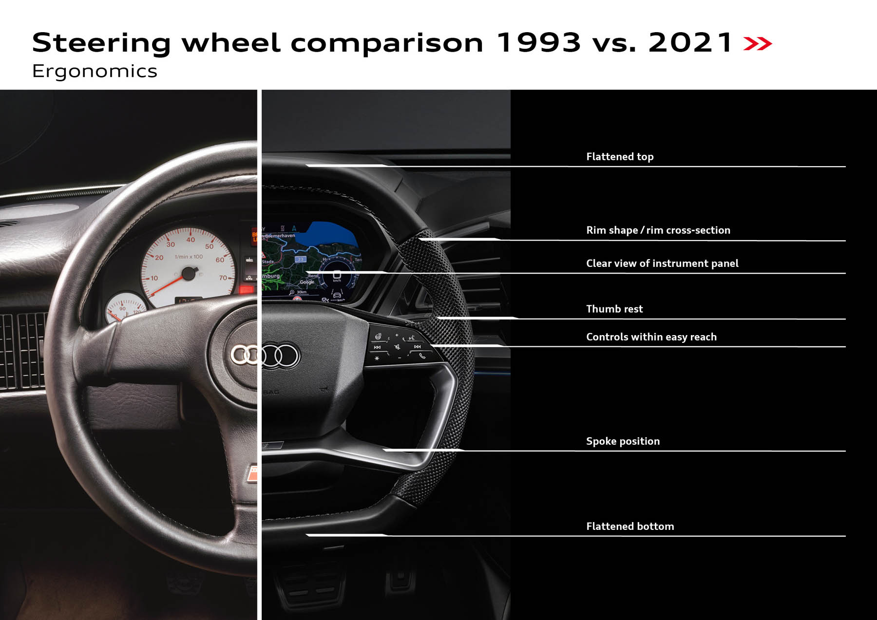 – Ακόμα και τα παλαιότερα οχήματα της Audi όπως το Type Α και Type Β ήταν εξοπλισμένα με τιμόνια, τα οποία τότε ήταν ακόμη πολύ μεγάλα. Έχουν συμβεί πολλά από τότε – το τιμόνι έχει εξελιχθεί εξελικτικά με το αυτοκίνητο. Χάρη στο υδραυλικό τιμόνι, το οποίο η Audi παρουσίασε τη δεκαετία του 1980, έγινε μικρότερο και πιο εύχρηστο. Η δομή και η λειτουργία του έχουν επίσης αλλάξει. Μέχρι το τέλος της δεκαετίας του 1980, ένα τιμόνι με σύνθετο πλαίσιο που ενσωμάτωνε μόνο τη λειτουργία κόρνας εξακολουθούσε να χρησιμοποιείται.