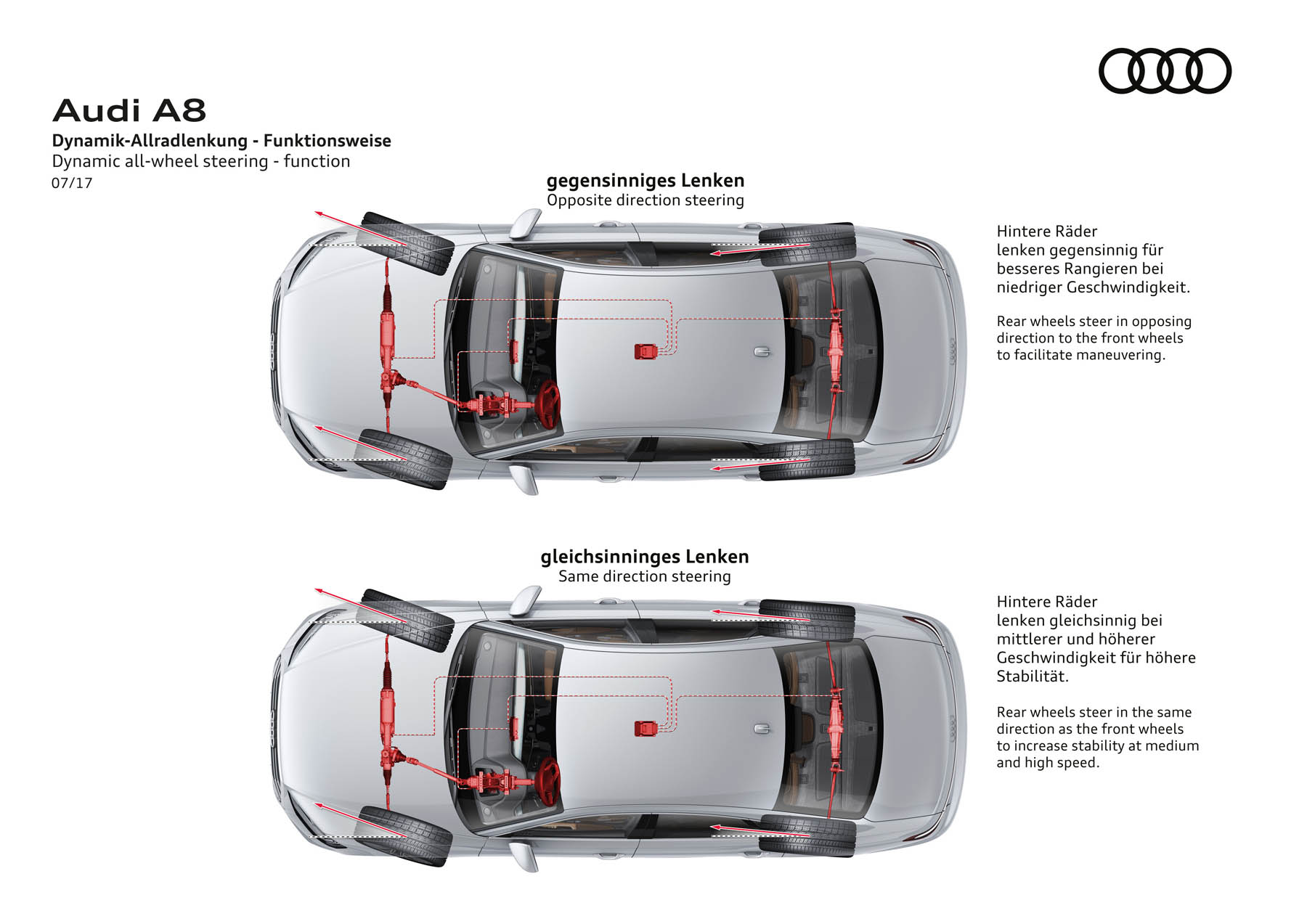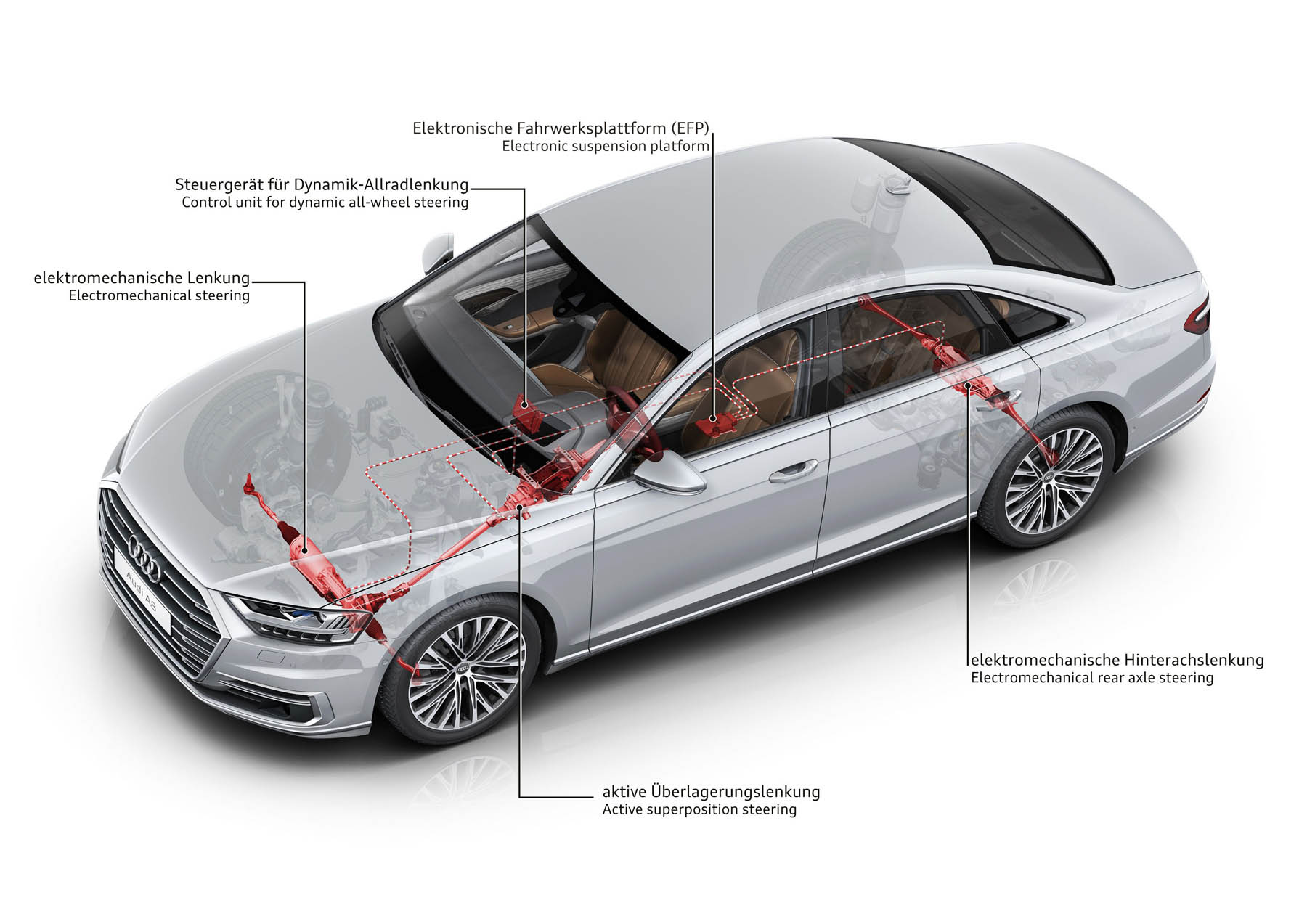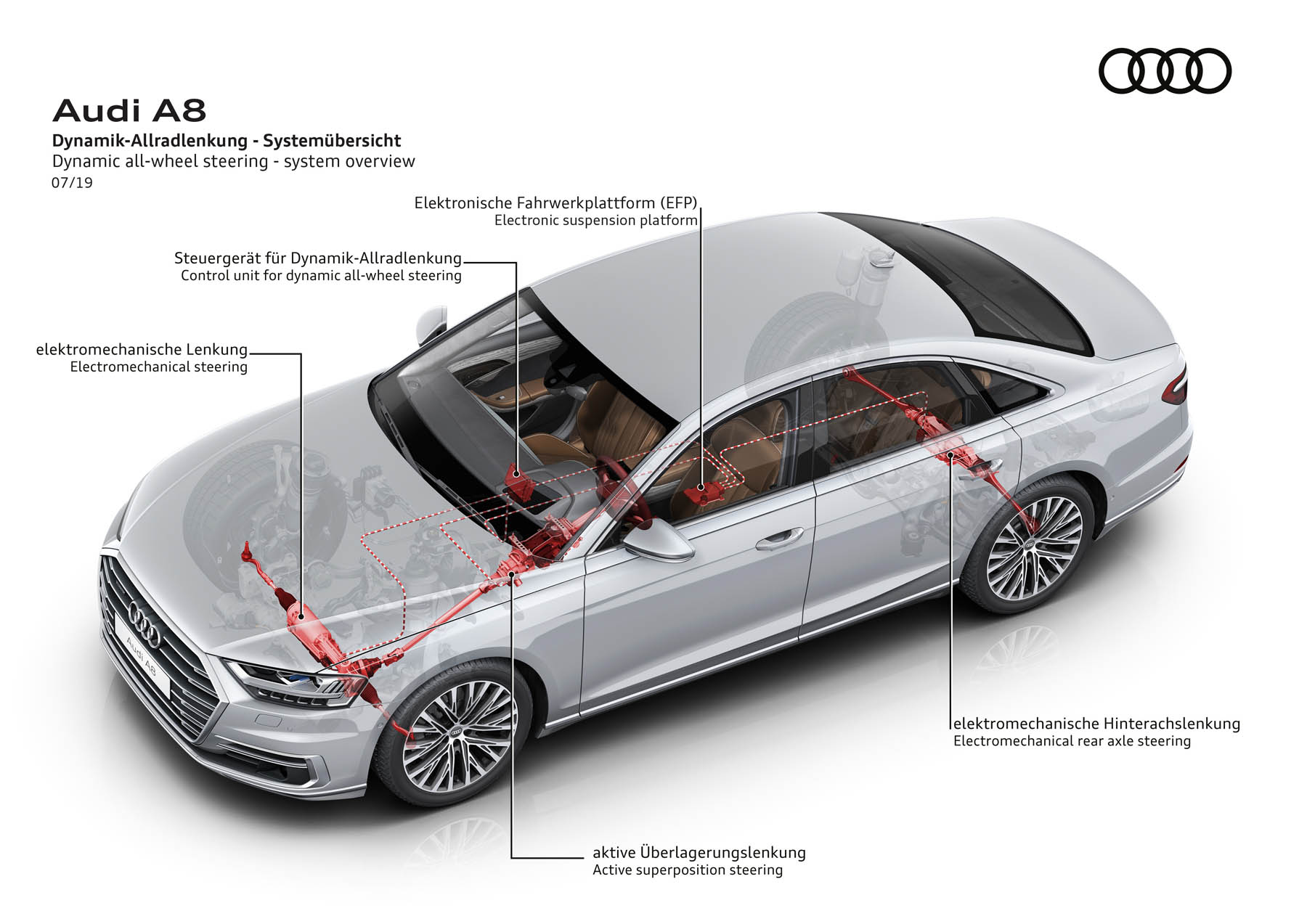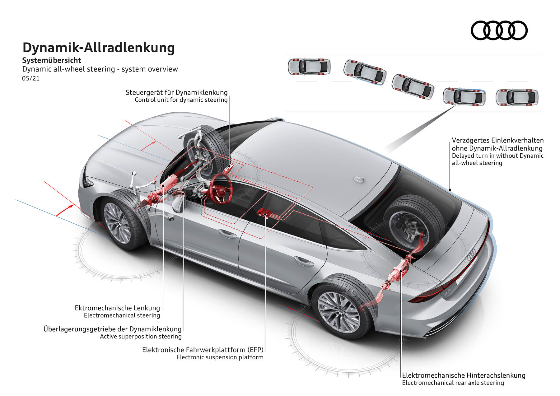 Το δυναμικό σύστημα διεύθυνσης μεταβάλλει τον βαθμό εφαρμογής του έως και 100%, ανάλογα με την ταχύτητα οδήγησης, τη γωνία διεύθυνσης και τη λειτουργία που επιλέγεται στο σύστημα δυναμικής συμπεριφοράς Audi drive select. Το κεντρικό εξάρτημα είναι το γρανάζι υπέρθεσης στην κολόνα τιμονιού. Μεταφέρει τις εντολές του οδηγού τόσο άμεσα όσο σε ένα όχημα με μια συμβατική κολόνα τιμονιού. Υπάρχει επίσης μια άμεση μηχανική σύνδεση με τον μπροστινό άξονα και τη σχετική ανάδραση από τους τροχούς. Όταν το γρανάζι υπέρθεσης ελέγχεται από τον ηλεκτροκινητήρα, αυξάνει ή μειώνει τη γωνία διεύθυνσης, η οποία προσαρμόζει συνεχώς την αναλογία διεύθυνσης ανάλογα με τη δεδομένη κατάσταση οδήγησης. Αυτό βελτιώνει την οδηγική άνεση και τη συμπεριφορά ανάλογα με την ταχύτητα και την οδηγική κατάσταση. Σε χαμηλές ταχύτητες οδήγησης – στην κίνηση της πόλης και κατά τη διάρκεια ελιγμών – η δυναμική οδήγηση λειτουργεί πολύ άμεσα. Το μόνο που χρειάζεται είναι δύο πλήρεις στροφές για μετάβαση από τέρμα σε τέρμα. Η υποβοήθηση είναι επίσης υψηλή, γεγονός που καθιστά ευκολότερη τη διαδικασία στάθμευσης και τους ελιγμούς. Σε επαρχιακούς δρόμους, η ηλεκτρική υποβοήθηση μειώνεται σταδιακά. Ο μεταβλητός λόγος και η υποβοήθηση χαμηλής ισχύος χρησιμοποιούνται για καλύτερη αίσθηση σε γρήγορες ταχύτητες σε δρόμους ταχείας κυκλοφορίας.