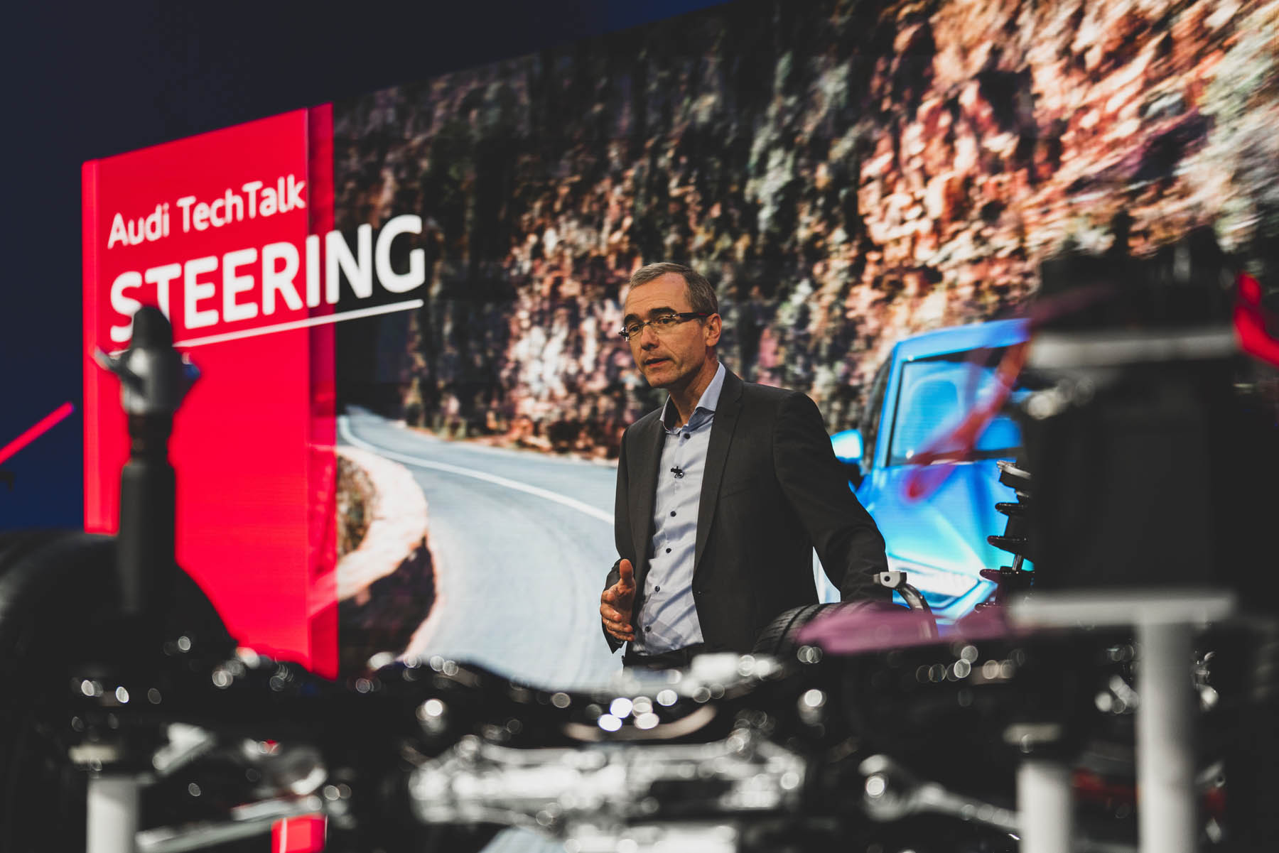 – Η ισορροπία του συστήματος διεύθυνσης επηρεάζεται ουσιαστικά από τα τρία στοιχεία της φυσικής οδήγησης: διαμήκη, πλευρική και κατακόρυφη δυναμική. Εκτός από την επιτάχυνση και την επιβράδυνση του οχήματος, οι πλευρικές δυνάμεις που προκύπτουν κατά την οδήγηση σε καμπύλη τροχιά, καθώς και οι διακυμάνσεις του φορτίου των τροχών και οι δονήσεις μάζας στο σασί έχουν επίσης αντίκτυπο. Ο κύριος στόχος για τους μηχανικούς της Audi είναι η κατάλληλη ανατροφοδότηση από τις δυνάμεις του μπροστινού άξονα σε σχέση με τις συνθήκες οδήγησης, την ισορροπία, το επίπεδο πρόσφυσης και τις ανωμαλίες στον δρόμο.