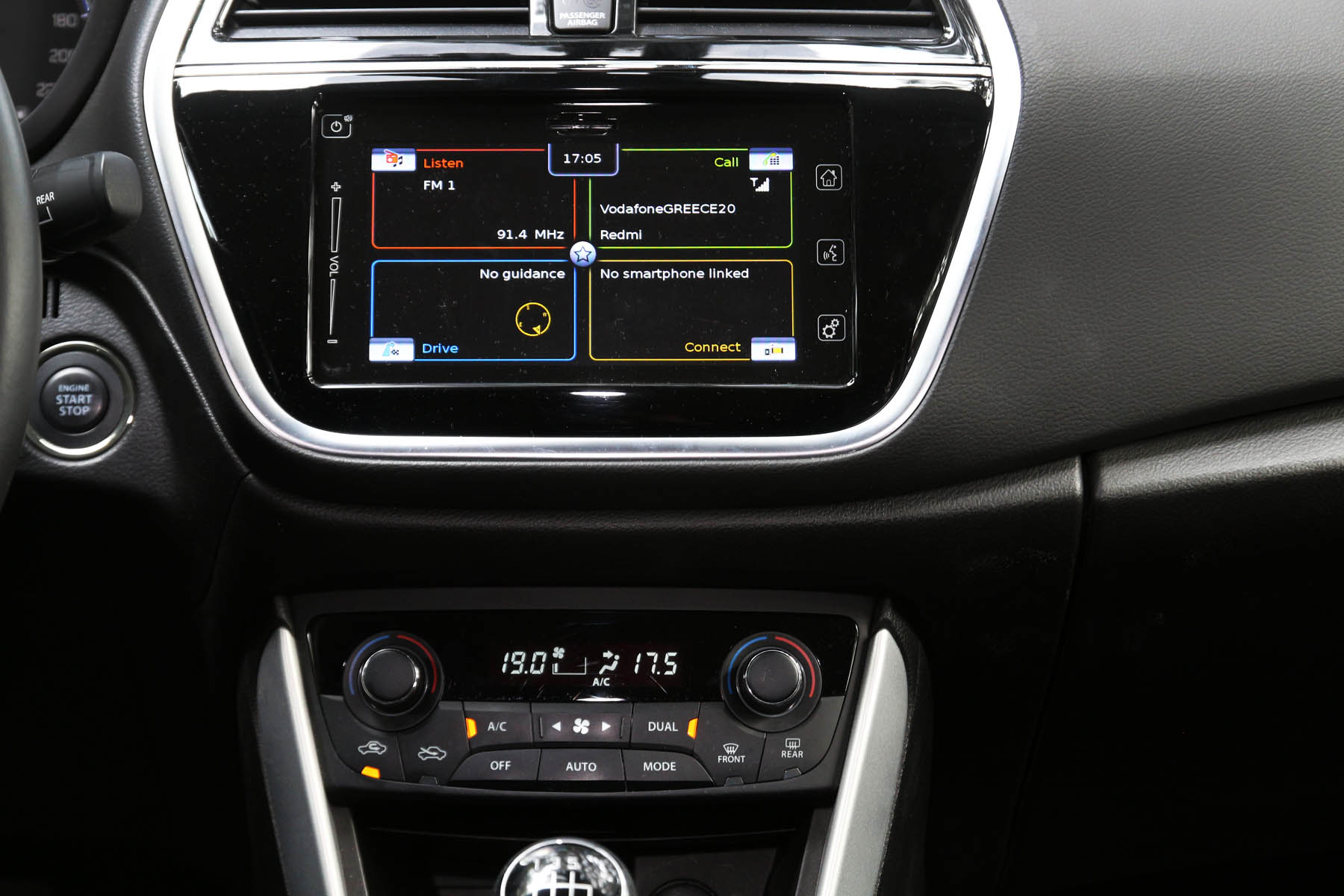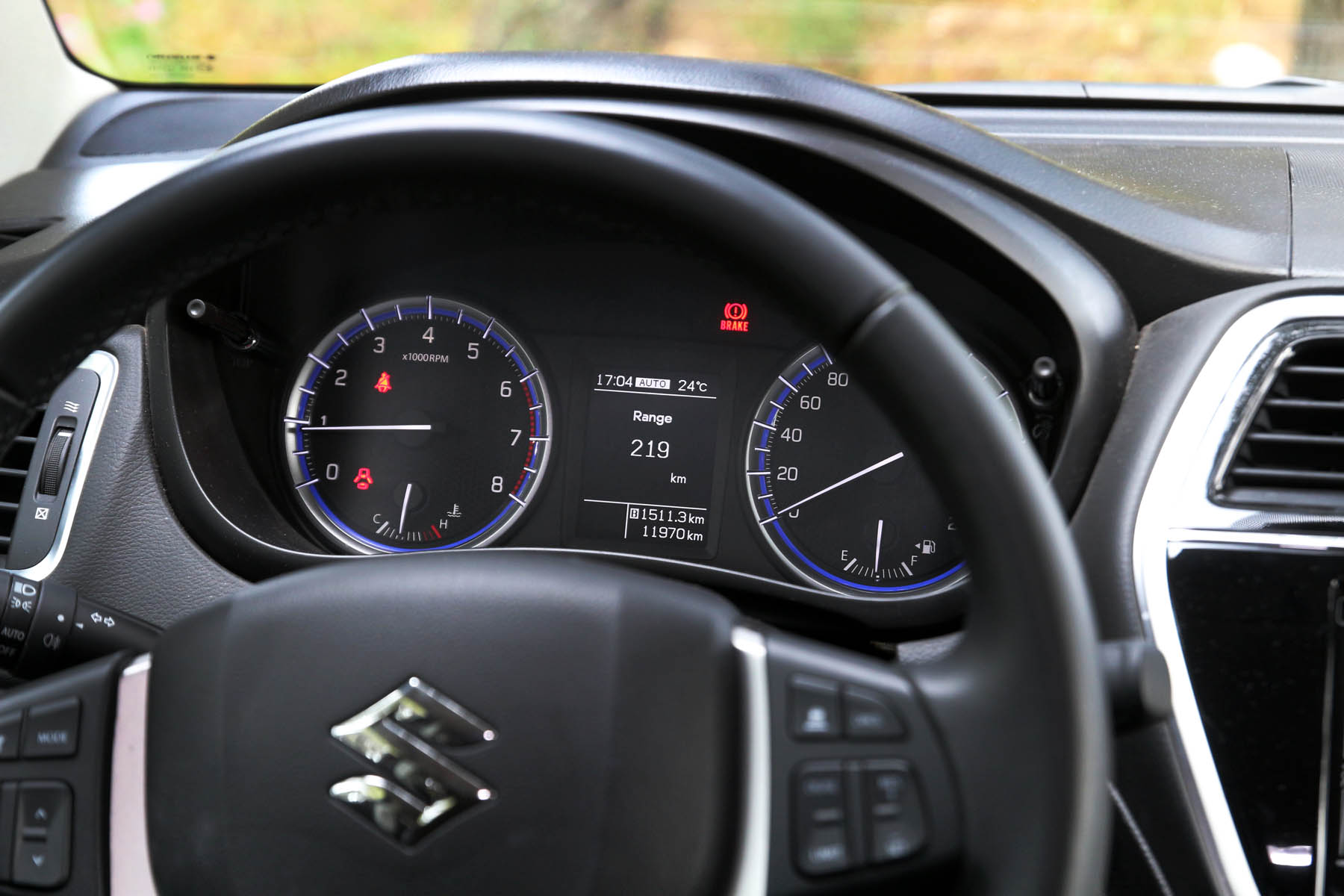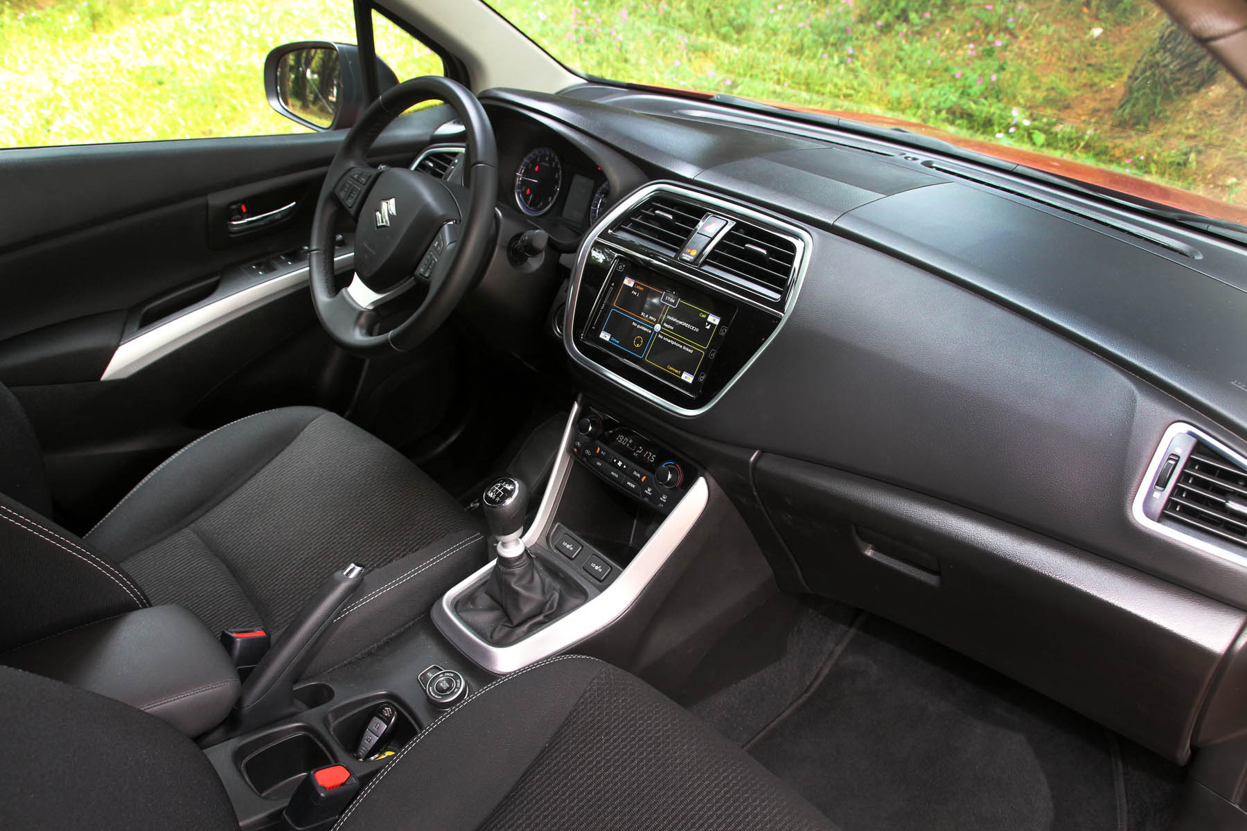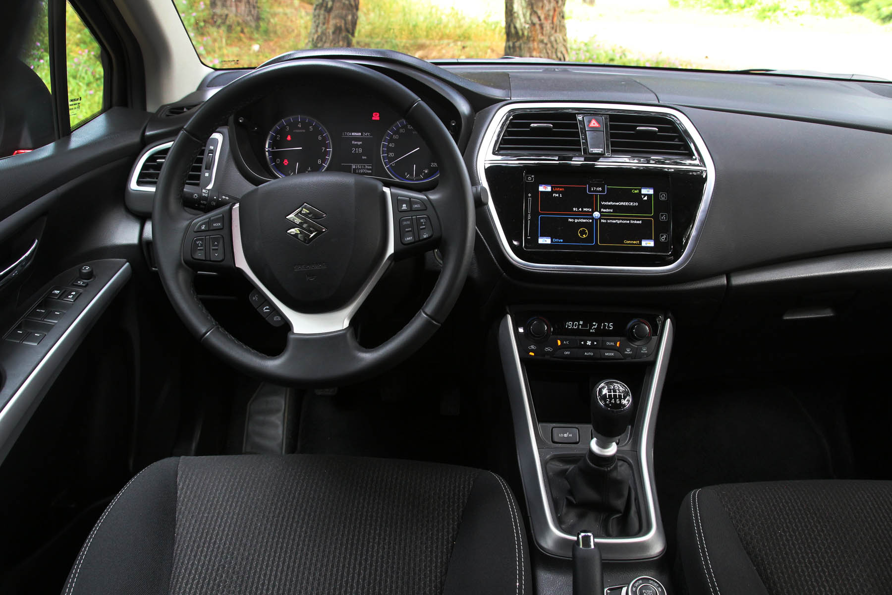 Σε κάθε περίπτωση ο εξοπλισμός περιλαμβάνει τα πάντα, ακόμα και θερμαινόμενα καθίσματα στην πλούσια έκδοση, ενώ το σύστημα για αναζήτηση αντικειμένων στις νεκρές γωνίες του αυτοκινήτου αποδεικνύεται στην πράξη πολύ βοηθητικό. Ζωτικής σημασίας και το σύστημα αποφυγής σύγκρουσης που είναι πάντοτε άγρυπνο alert σε οποιαδήποτε απροσεξία του οδηγού. Η καμπίνα του S-Cross παραμένει ως έχει, με σκληρά πλαστικά στο ταμπλό και τις πόρτες, που μπορεί να μην συμβαδίζουν με τις απαιτήσεις των καιρών, αλλά ταυτόχρονα δεν εγείρονται ζητήματα τριγμών κλπ. Στο ταμπλό ξεχωρίζει ασφαλώς το πλαίσιο piano black γύρω από την οθόνη 7” του συστήματος πολυμέσων., καθώς το συγκεκριμένο σύστημα είναι σχετικά αναβαθμισμένο σε γραφικά και λειτουργεί με εντολές αφής αλλά και φωνητικές, διαθέτοντας παράλληλα και συνδεσιμότητα με το διαδίκτυο και το κινητό σας.