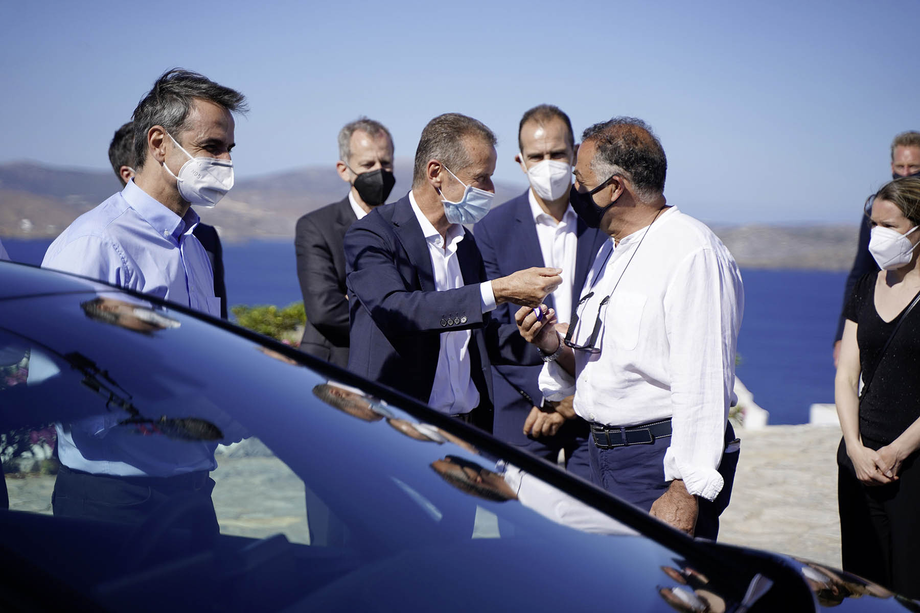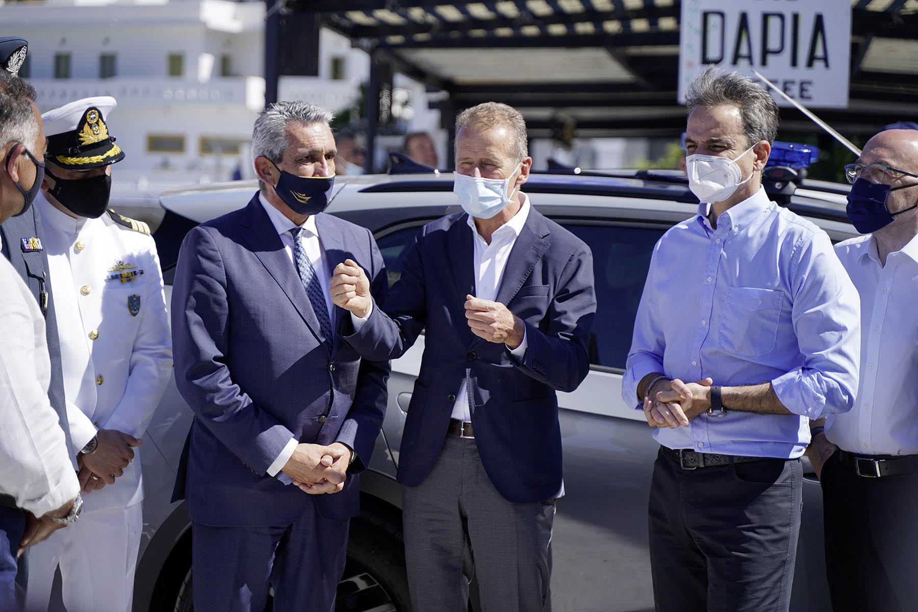 Volkswagen CEO Herbert Diess and Prime Minister Kyriakos Mitsotakis handover Greece’ first electric police car in Astypalea.