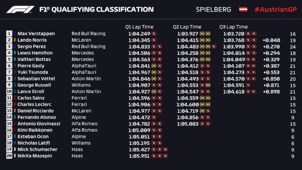 Mία εβδομάδα μετά την πειστική κυριαρχία της Red Bull, το σενάριο φαίνεται να επαναλαμβάνεται και πάλι στην Αυστρία, με τον Verstappen να δείχνει σ’ αυτή την φάση του πρωταθλήματος ότι είναι ο κυρίαρχος του παιχνιδιού. Πρόκειται για την τρίτη συνεχόμενη pole του Verstappen και δείχνει ότι εκτός απροόπτου θα έχει τον πρώτο λόγο στον αυριανό αγώνα.