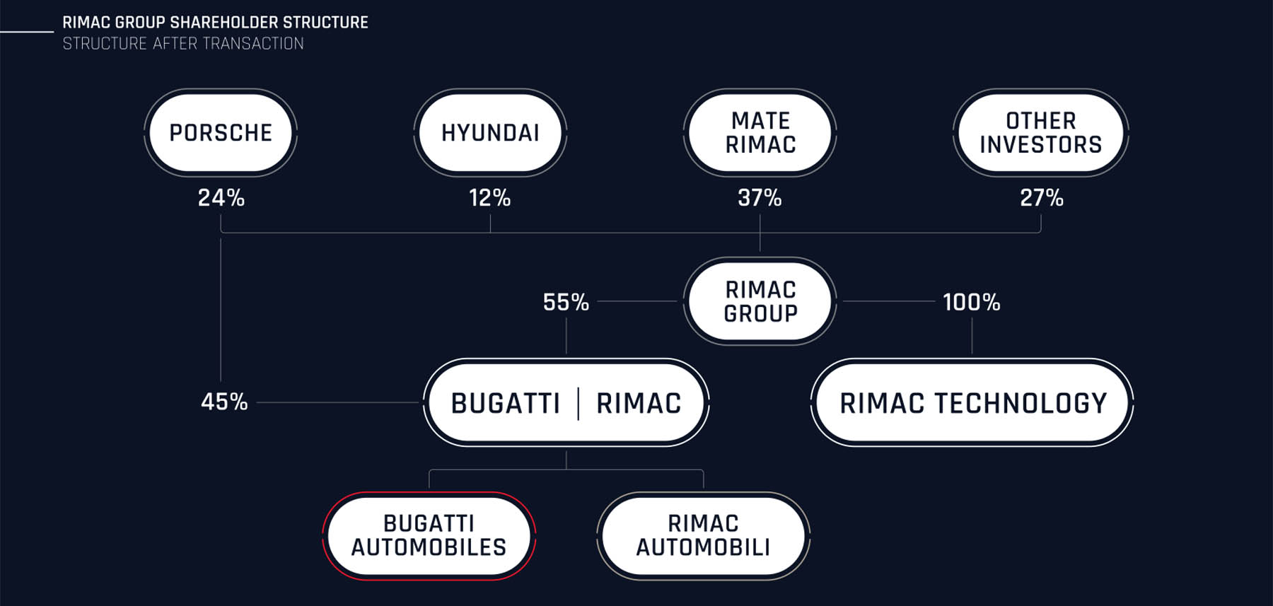 Φαινομενικά το πάντρεμα της Bugatti με την Rimac δείχνει πως η πρώτη έχει τον έλεγχο. Ωστόσο, τα πράγματα δεν είναι έτσι αφού το νέο εταιρικό σχήμα μπορεί το 45% να κατέχει η Rimac και το 55% η Porsche, αλλά υπάρχει μια μικρή λεπτομέρεια.