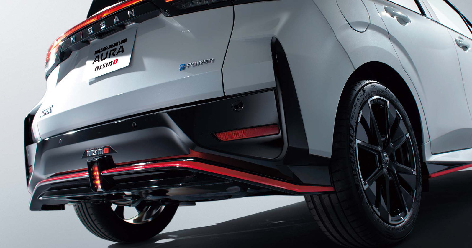 Ο αστικός, εξορθολογισμένος, νέας γενιάς σχεδιασμός της NISMO, εκφράζει τη ζωτικότητα και αποτυπώνει την αίσθηση αιχμής των ηλεκτροκίνητων οχημάτων. Με την εμβληματική διπλή αεροτομή της NISMO με έντονο κόκκινο χρώμα, το Note Aura NISMO διαθέτει χαμηλή και μεγάλου πλάτους σιλουέτα. Το επανασχεδιασμένο έμβλημα της NISMO, σε ματ αποχρώσεις χρωμίου και κόκκινου, τονίζει τον χαρακτήρα NISMO του αυτοκινήτου.
