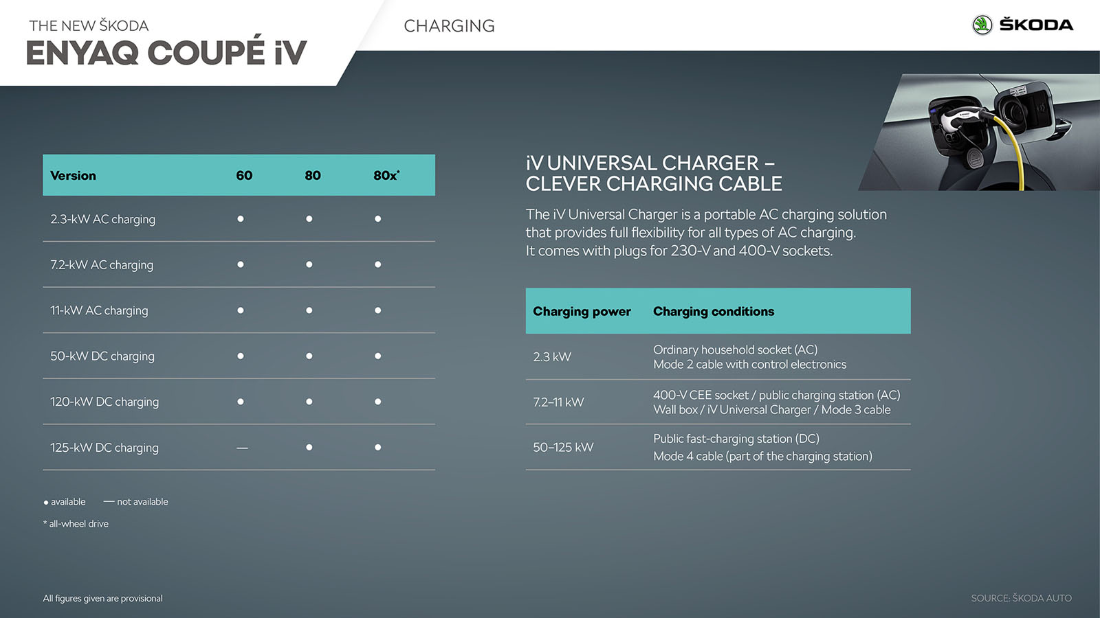 Το ENYAQ COUPÉ iV 80x είναι εξοπλισμένο με τη μεγαλύτερη μπαταρία, η οποία τροφοδοτεί επίσης ένα δεύτερο ηλεκτροκινητήρα 80 kW στον μπροστινό άξονα, εξασφαλίζοντας τετρακίνηση. Μαζί, οι δύο ηλεκτροκινητήρες αποδίδουν συνολικά 195 kW (265 PS). Χρησιμοποιώντας φορτιστή τοίχου εναλλασσόμενου ρεύματος έως 11 kW – π.χ. ένας φορτιστής SKODA iV – το ολοκαίνουργιο κουπέ μπορεί να φορτιστεί πλήρως σε έξι έως οκτώ ώρες. Το ENYAQ COUPÉ iV μπορεί επίσης να φορτιστεί σε δημόσιους σταθμούς ταχείας φόρτισης DC, με ισχύ έως 125 kW.