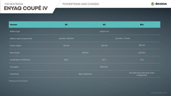 Η SKODA θα προσφέρει το ENYAQ COUPÉ iV σε δύο μεγέθη μπαταρίας και τρεις διαφορετικές εκδόσεις ισχύος. Το ENYAQ COUPÉ iV 60 είναι εξοπλισμένο με μπαταρία ιόντων λιθίου χωρητικότητας 62 kWh (58 kWh net). Ο ηλεκτροκινητήρας παράγει 132 kW (180 PS) και κινεί τους πίσω τροχούς. Το ENYAQ COUPÉ iV 80 έχει επίσης κίνηση στους πίσω τροχούς, με ηλεκτρικό μοτέρ ισχύος 150 kW (204 PS). Όταν είναι εφοδιασμένο με το μεγαλύτερο πακέτο μπαταρίας 82 kWh (77 kWh net) και χάρη στην εξαιρετική αεροδυναμική του αυτοκινήτου με συντελεστή οπισθέλκουσας (Cd) 0,247, αυτή η έκδοση μπορεί να καλύψει περισσότερα από 535 χιλιόμετρα με μία φόρτιση.