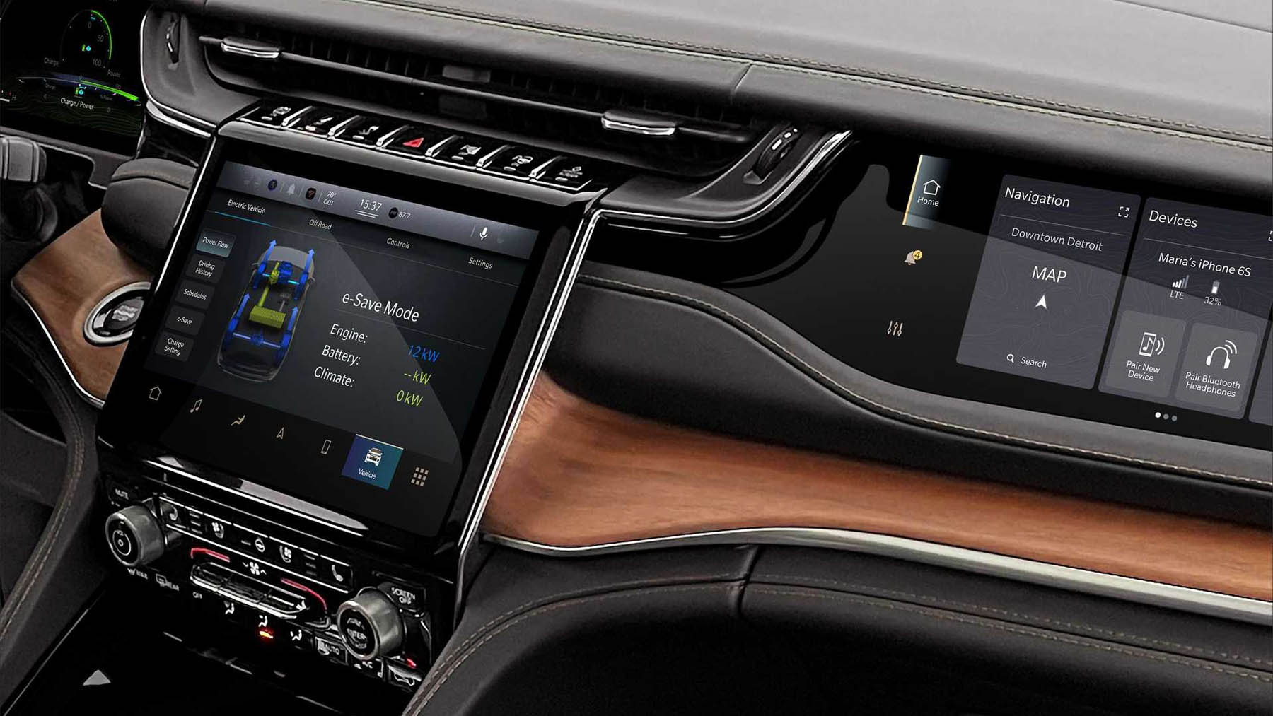 Στη δημιουργία μιας απόλυτα premium αίσθησης συμβάλει ο ρυθμιζόμενος φωτισμός LED της καμπίνας, ενώ τη κορυφαία συνδεσιμότητα που προσφέρει το σύστημα πολυμέσων Uconnect 5 με την ασύρματη λειτουργία mirroring και τη συμβατότητα με δίκτυα 5G, συμπληρώνει η δυνατότητα ταυτόχρονης ασύρματης φόρτισης δύο συσκευών κινητής τηλεφωνίας.
