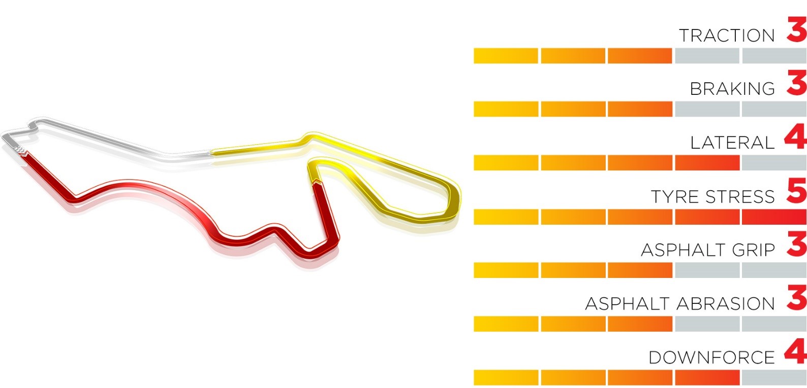 - Πολλές ακόμη στροφές ασκούν υψηλές δυνάμεις στα ελαστικά: Η στροφή 1 έχει κατηφορική κλίση πριν ανηφορίσει ξανά ενώ και η πίσω ευθεία έχει ένα ύψωμα (χάσιμο) που ονομάζεται ‘Faux Rouge’ καθώς μοιάζει με το αντίστοιχο στο Σπα. Συνολικά στην πίστα αξιοποιείται με τον καλύτερο τρόπο μια επίπεδη περιοχή χωρίς υψομετρικές διακυμάνσεις.