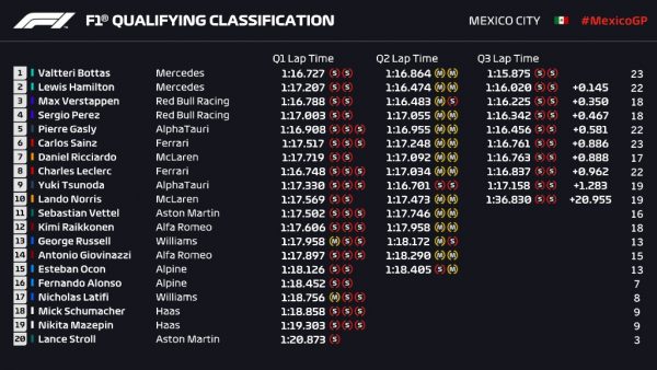 ¡BOTTAS TAKES POLE IN MEXICO! 🎉@MercedesAMGF1 lock out the front row with Hamilton in P2, while Verstappen takes P3 #MexicoGP 🇲🇽 #F1 pic.twitter.com/nSmq3ajIzz