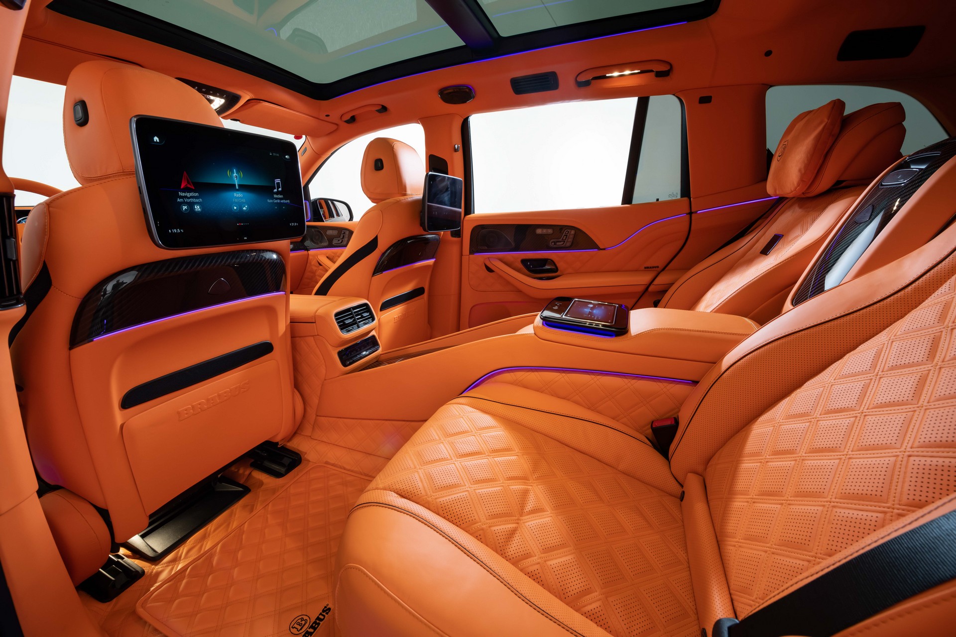 Την κυριαρχία του πορτοκαλί χρώματος σπάνε σε ελάχιστα σημεία κάποιες επενδύσεις από κάρμπον και οι πολλές οθόνες που διαθέτει στον εξοπλισμό του το αυτοκίνητο. Εξοπλισμός που παραμένει στα απολύτως κορυφαία επίπεδα που περιμένει κανείς από το πιο ακριβό και πολυτελές SUV της Mercedes.
