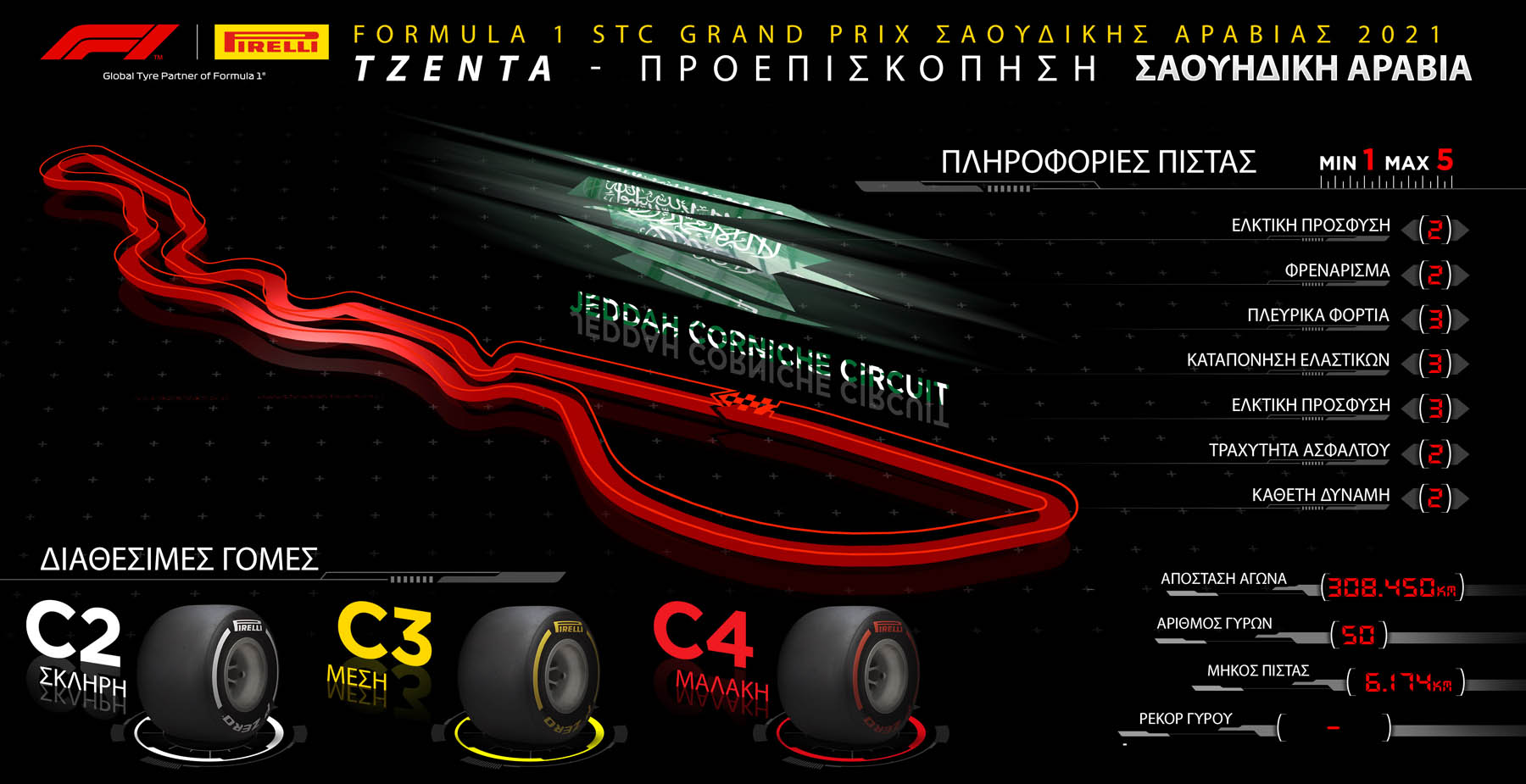 Η Pirelli επέλεξε τις τρεις μεσαίες γόμες της γκάμας της για την πρώτη επίσκεψή στην νέα διαδρομή εντός πόλης, της Τζέντα. Η Σαουδική Αραβία είναι η 34η χώρα που φιλοξενεί αγώνα. Η Pirelli έφερε τη γόμα C2 ως P Zero λευκή σκληρή, τη γόμα C3 ως P Zero κίτρινη μέση και τη C4 ως P Zero κόκκινη μαλακή: πρόκειται για τον πιο δημοφιλή συνδυασμό φέτος.
