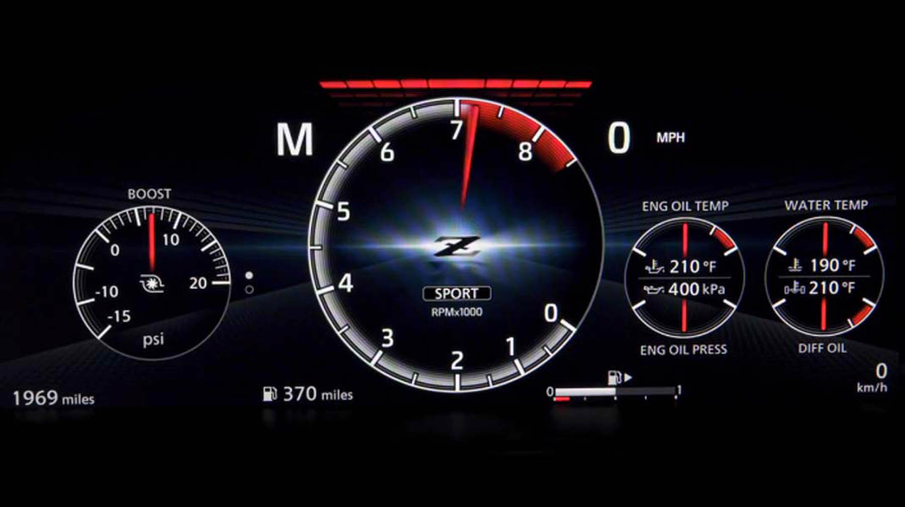 Στροφόμετρο: Το νέο Z διαθέτει ενδείξεις αλλαγής ταχυτήτων, όπως ακριβώς  σε ένα αγωνιστικό αυτοκίνητο, οι οποίες ειδοποιούν τον οδηγό την ακριβή στιγμή για να ανεβάσει ταχύτητα. Ο μετρητής είναι τοποθετημένος με την κόκκινη γραμμή στραμμένη ευθεία προς τα πάνω (όπως στην ένδειξη δώδεκα η ώρα στο ρολόι), διευκολύνοντας την ορατότητα της βελόνας του στροφόμετρου όταν πλησιάζει σε αυτό το σημάδι. Αυτές οι προτάσεις έγιναν από τον επαγγελματία οδηγό αγώνων Tsugio Matsuda, έναν έμπειρο οδηγό αγώνων της Nissan στο GT500.