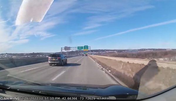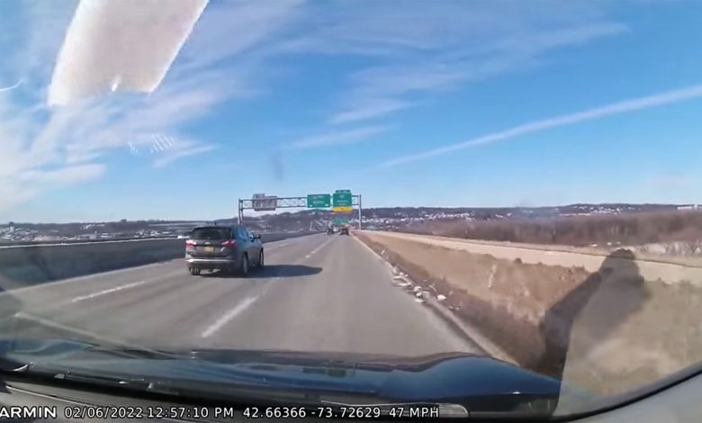 Όπως θα δείτε στο παρακάτω βίντεο στην αριστερή λωρίδα κυκλοφορίας -σε έναν αυτοκινητόδρομο στο Albany των ΗΠΑ- προπορεύεται ένα αυτοκίνητο που στην οροφή του έχει ξεμείνει χιόνι. Το οποίο όμως έχει παγώσει τόσο πολύ που έχει γίνει μια πλάκα.
