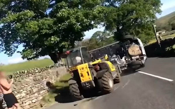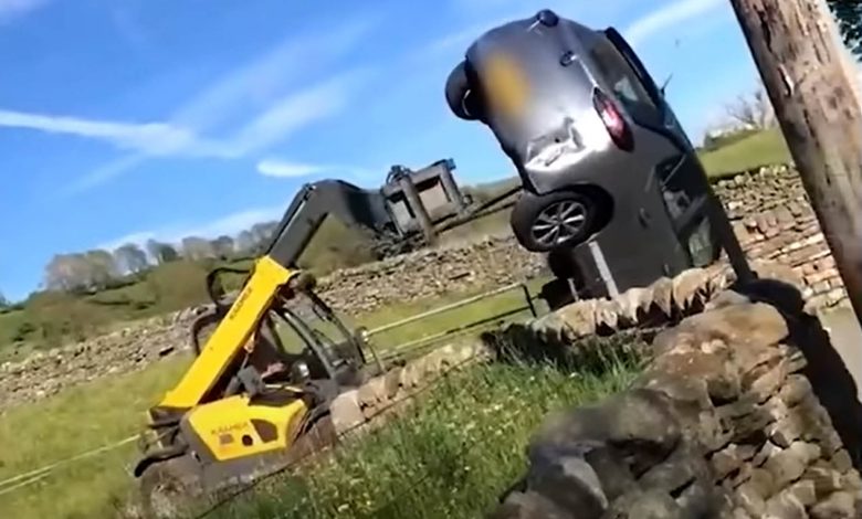 O αγρότης τα πήρε και αποφάσισε να απομακρύνει μόνος του το Corsa. Με τον τρόπο που βλέπετε. Πήρε το γεωργικό του μηχάνημα, σήκωσε στον αέρα το αυτοκίνητο και το έβγαλε έξω σέρνοντας το στην άσφαλτο. Τα πράγματα θα μπορούσαν να είχαν άσχημη κατάληξη αν οι δαγκάνες του μηχανήματος χτυπούσαν τον 21χρονο.