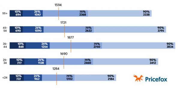 Αξίζει να σημειωθεί ότι 35% των νέων και κυρίως απόφοιτων αμείβεται λιγότερο από 1000€ μικτά το μήνα. Επίσης, στις ηλικίες 55+, περίοδος πριν τη συνταξιοδότηση, οι αμοιβές παρουσιάζουν πτώση σε σχέση με την ηλικιακή ομάδα 45-54 κατά 8%.