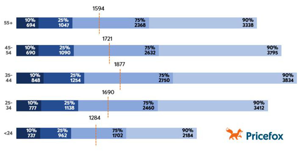 Η ηλικιακή ομάδα 35-44 είναι η καλύτερα αμειβόμενη στην Ελλάδα με τη διάμεσο τον αποδοχών να κυμαίνεται κοντά στα 1900€ μηνιαίως με το 15% αυτών να λαμβάνει από 2750€ έως 3834€ μηνιαίως.