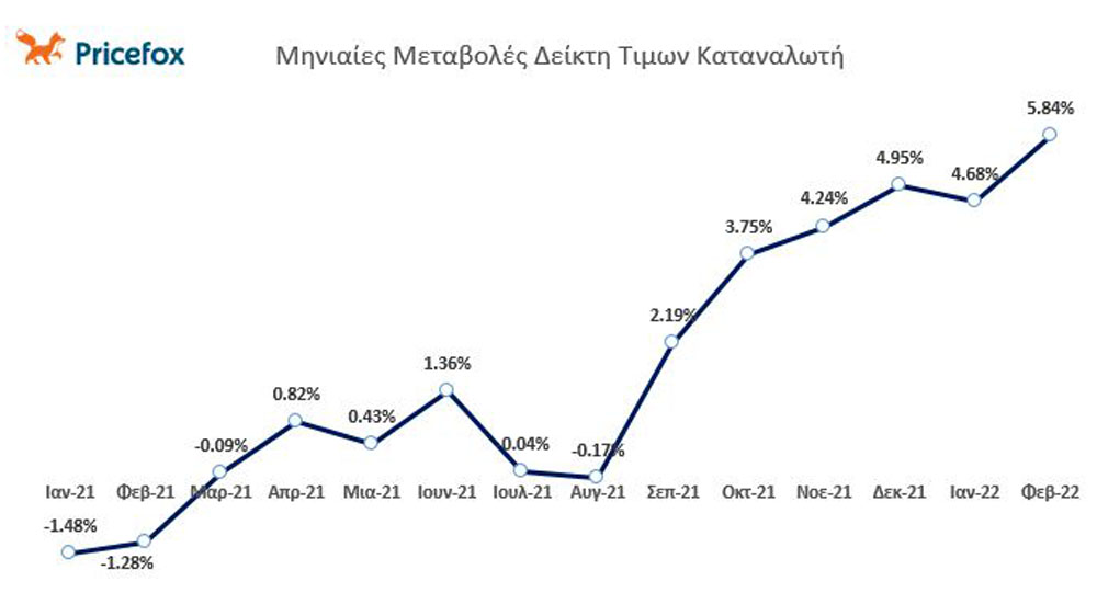 Στο παρακάτω γράφημα παρουσιάζεται η εξέλιξη του δείκτη τιμών καταναλωτή από τον Σεπτέμβριο του 2021 μέχρι τον Φεβρουάριο του 2022.