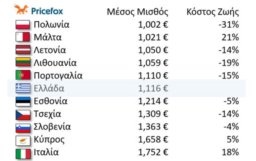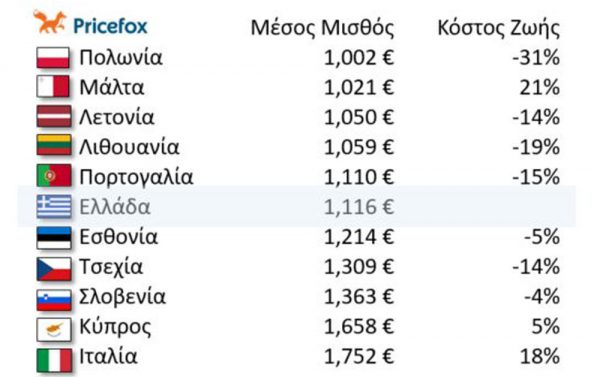 Στον παρακάτω πίνακα παρουσιάζεται ο μέσος μικτός μηνιαίος μισθός σε χώρες της Ευρώπης με παραπλήσια μεγέθη και το η σύγκριση του κόστους ζωής σε σχέση με την Ελλάδα.