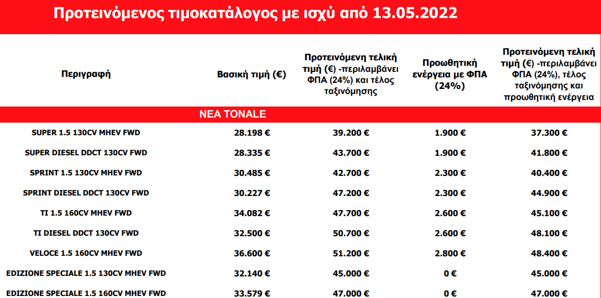Αξιοσημείωτο είναι πως όλες οι διαθέσιμες Tonale είναι προσθιοκίνητες FWD. Σημειώστε δε πως ανάλογα με την έκδοση για το λανσάρισμα υπάρχει έκπτωση από 1.900€ έως 2.800€.