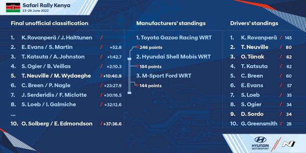 H Toyota είναι πολύ δυνατή στο χώμα και το απέδειξε και στην Κένυα με τέσσερα πληρώματα της να τερματίζουν πρώτα. Στο βάθρο ανέβηκαν οι Rovanpera, Evans και Katsuta, ενώ ακολούθησε ο Ogier.