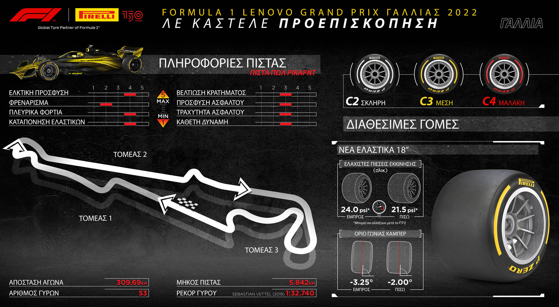 Η γόμα C2 είναι η P Zero λευκή/σκληρή, η C3 είναι η P Zero κίτρινη/μέση γόμα και η C4 είναι η P Zero κόκκινη/μαλακή γόμα: Αυτά τα τρία ελαστικά επιλέχθηκαν για το Γαλλικό Grand Prix και την πίστα του Paul Ricard.