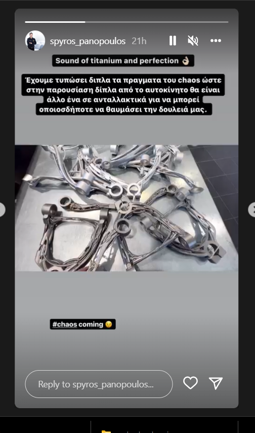 Υπενθυμίζουμε πως το Chaos θα κινείται από έναν V10 με 4.000 κ.εκ. και δύο turbo ειδικά εξελιγμένο από το Σπύρο Πανόπουλο, ο οποίος στη στάνταρ εκδοχή του αποδίδει 2.000 ίππους και στην κορυφαία 3.000.