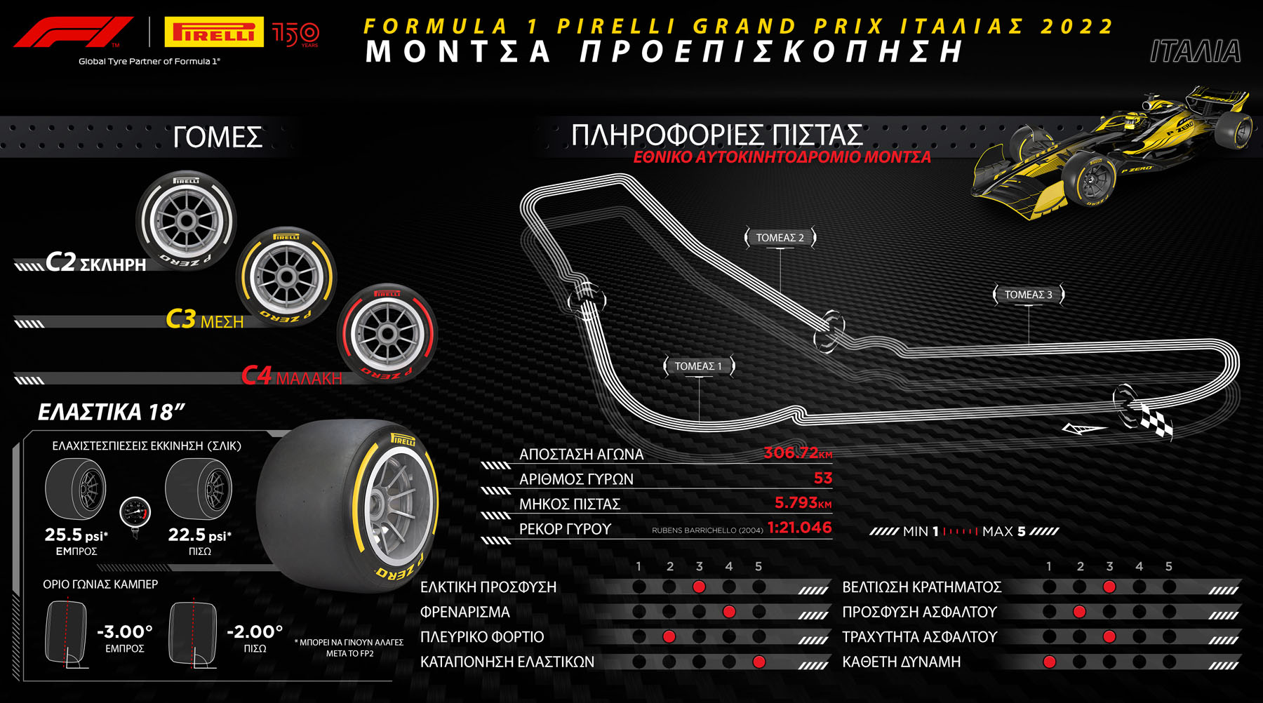 Τα τρία ελαστικά από το μέσο της γκάμας μας επιλέχθηκαν για τη Monza: η C2 είναι η P Zero λευκή/σκληρή γόμα, η C3 είναι η P Zero κίτρινη/μέση γόμα και η C4 είναι η P Zero κόκκινη/μαλακή γόμα.