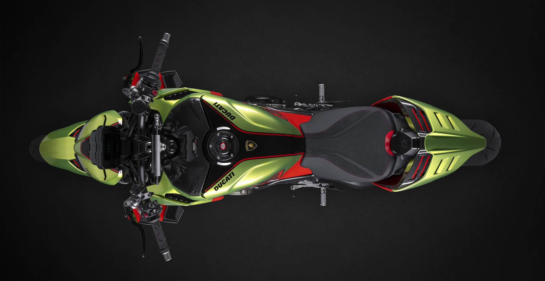 Μία ακόμα ένδειξη της εμμονικής προσοχής στη λεπτομέρεια που χαρακτηρίζει αυτή τη μοτοσυκλέτα είναι το γεγονός ότι όλα τα εξαρτήματα τα οποία είναι κατασκευασμένα από ανθρακονήματα (συμπεριλαμβανομένου του εμπρός λασπωτήρα, του προστατευτικού του κινητήρα, του καλύμματος του ψυγείου, των φτερών, του καλύμματος του ρεζερβουάρ και της ουράς) είναι φτιαγμένα με την ίδια υφή με εκείνη που υπάρχει στα αυτοκίνητα από την εταιρεία της Sant’Agata Bolognese. Η σέλα της Streetfighter V4 Lamborghini είναι επίσης εμπνευσμένη από το φινίρισμα των καθισμάτων της Huracán STO, καθώς διαθέτει ανταύγειες στο ίδιο χρώμα με αυτό που έχουν τα πλαστικά της μοτοσυκλέτας.