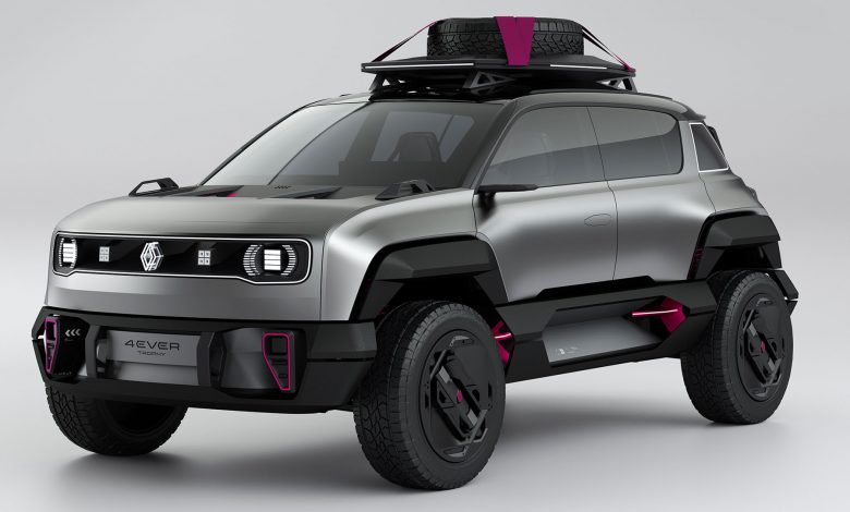 Όπως μπορούμε να δούμε το πρωτότυπο 4Ever έχει μια περίσσεια αέρα από Trophy για να μας παραπέμψει στην εποχή που η Renault συμμετείχε σε αγώνες σαφάρι. Το αμάξωμα των 4,16 μέτρων βρίσκεται αρκετά ψηλά από το έδαφος και τονίζεται από διάφορα εκτός δρόμου στοιχεία.