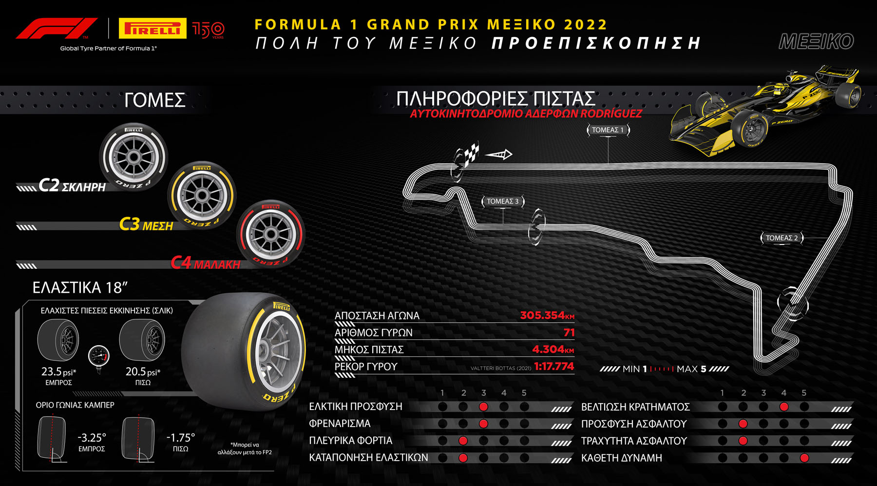 MARIO ISOLA – ΔΙΕΥΘΥΝΤΗΣ ΜΗΧΑΝΟΚΙΝΗΤΟΥ ΑΘΛΗΤΙΣΜΟΥ: «Κατά τη διάρκεια της σεζόν τα ελαστικά μας πρέπει να ανταπεξέλθουν σε μια ευρεία ποικιλία συνθηκών οι οποίες διαμορφώνονται από τα μοναδικά χαρακτηριστικά κάθε πίστας. Αν κοιτάξετε στους δυο τελευταίους αγώνες στη Suzuka παίζουν ρόλο τα πλευρικά φορτία, στο Ώστιν το αεροδυναμικό ζύγισμα ενώ στο Μεξικό κυρίαρχο ρόλο έχει η ελκτική πρόσφυση και η σταθερότητα στο φρενάρισμα. Η πίστα που φέρει το όνομα των αδερφών Rodriguez δεν προσφέρει ιδιαίτερη πρόσφυση. Τα ενεργειακά φορτία που μεταφέρονται διαμέσου των ελαστικών είναι χαμηλά και τα μονοθέσια δεν έχουν τόσο μεγάλη αεροδυναμική απόδοση ειδικά στις αργές στροφές καθώς ο αέρας είναι αραιός σ’ αυτό το υψόμετρο (2238m). Φέτος πιθανόν θα δούμε περισσότερη φθορά στα εμπρός ελαστικά καθώς η σημερινή γενιά μονοθεσίων έχει υποστροφική τάση στις αργές στροφές – υπάρχουν αρκετές στην πίστα του Mεξικό. Η φύση της διαδρομής με πολύ σκόνη στην επιφάνεια του οδοστρώματος έχει ως αποτέλεσμα το κράτημα να βελτιώνεται θεαματικά κατά τη διάρκεια του τριημέρου. Η εκτίμηση του βαθμού βελτίωσης και η σωστή προθέρμανση των ελαστικών θα είναι κλειδί στην επιτυχία».