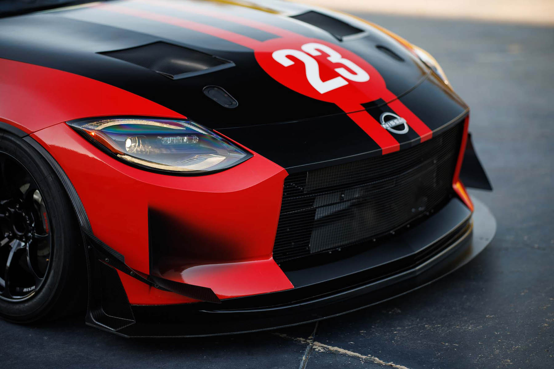 Το μπροστινό καπό απεικονίζει τον αριθμό 23, τον αποκλειστικό αριθμό της Nissan, αποτυπωμένο μέσα σε έναν κύκλο ανατέλλοντος ηλίου που θυμίζει την πολύ πρώιμη αγωνιστική δράση της δεκαετίας του ’70. Επιπλέον, τα νέα λογότυπα Z στο πίσω τέταρτο του πλαισίου, υπογραμμίζουν τη σύγχρονη ερμηνεία των αρχικών σημάτων 240Z και Fairlady Z, όλα αρμονικά πλαισιωμένα από τον εμβληματικό κόκκινο και μαύρο συνδυασμό χρωμάτων της Nissan και της NISMO.