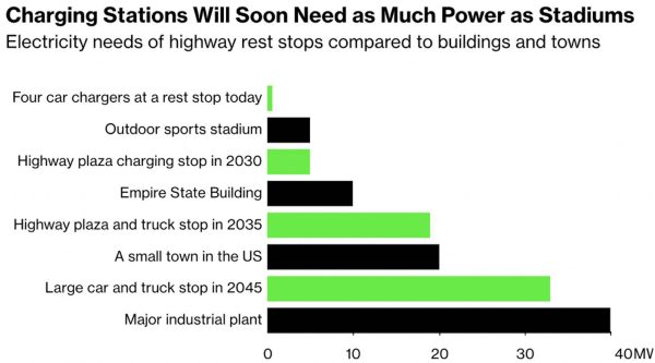 Μία έρευνα που δημοσιεύτηκε στην Αμερική, υποστηρίζει ότι το 2035, ένας κόμβος φόρτισης για ηλεκτρικά φορτηγά θα τραβά όσο ρεύμα χρειάζεται μία μικρή πόλη ή ένα στάδιο.