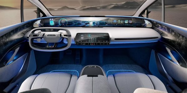 Οι πόρτες τύπου πεταλούδας ανοίγουν προς τα πάνω, αποκαλύπτοντας ένα εσωτερικό που είναι παρόμοιο με αυτό του SUV. Μια ξεχωριστή λεπτομέρεια είναι η μεγάλη οθόνη που καλύπτει ολόκληρο το πλάτος του ταμπλό. Επίσης, διαθέτει ένα οβάλ τιμόνι και μια μικρότερη οθόνη στο μέσον του ταμπλό, τοποθετημένη σε χαμηλότερο ύψος.