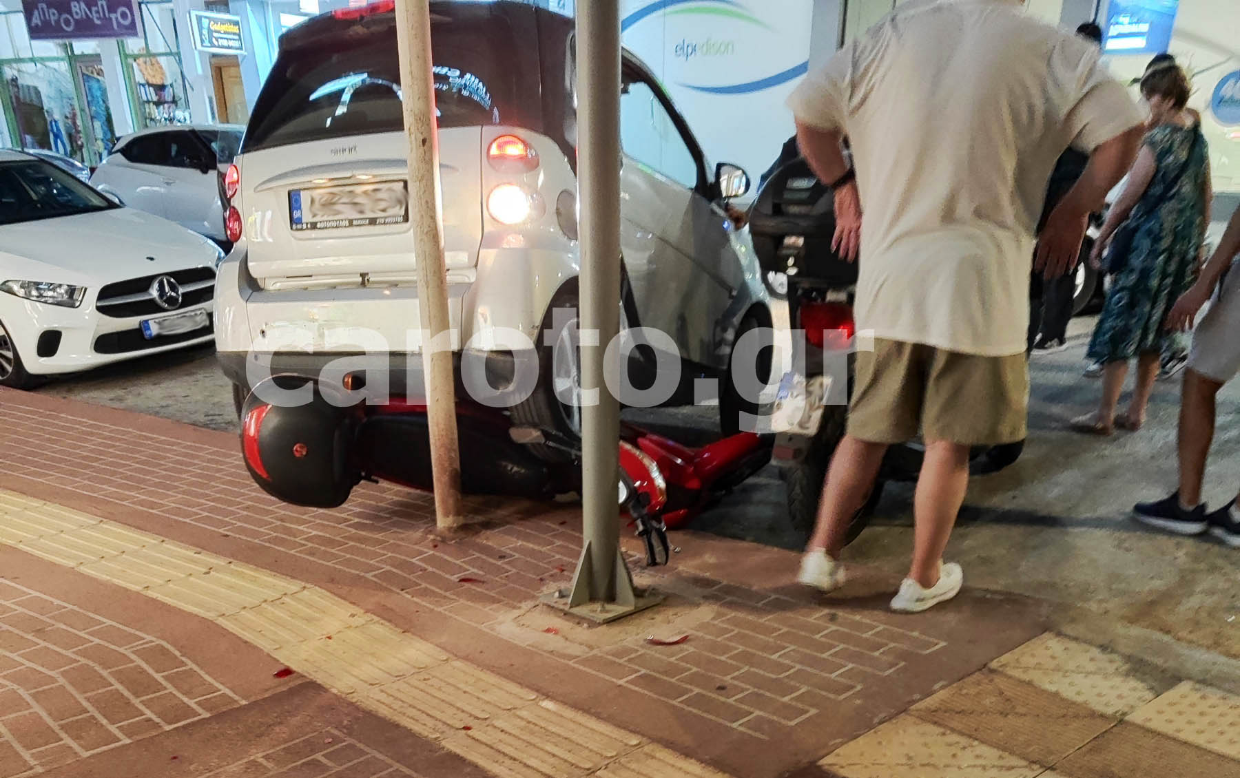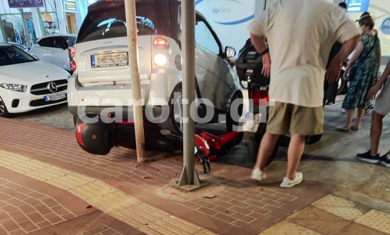Κούμπωσε την όπισθεν στο αυτόματο κιβώτιο και μετά ακολούθησε η απίστευτη σκηνή με το Smart να καβαλάει με ορμή το άτυχο μηχανάκι και αν δεν υπήρχε η κολώνα, θα είχε εισβάλει το αυτοκίνητο στη βιτρίνα του καταστήματος.