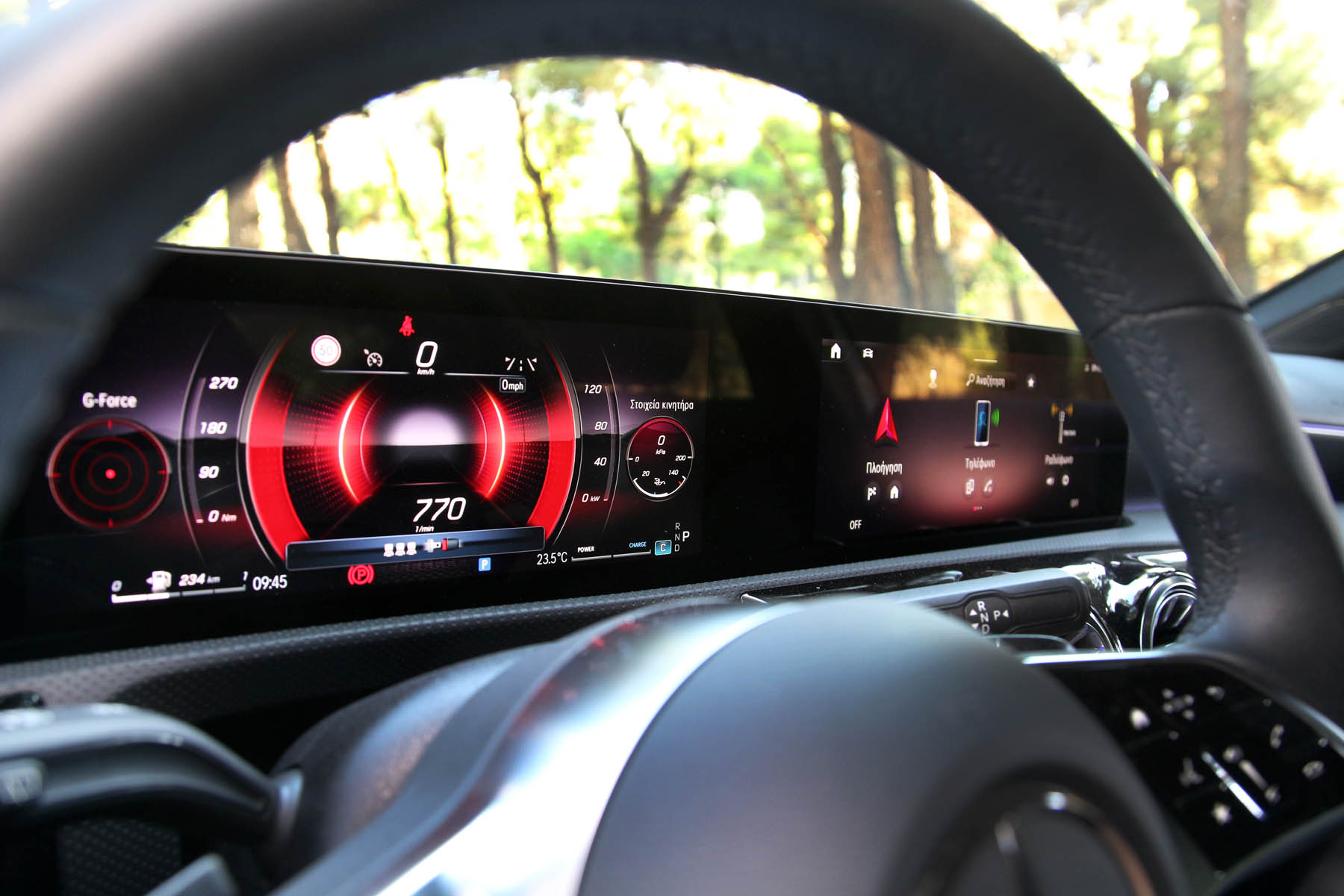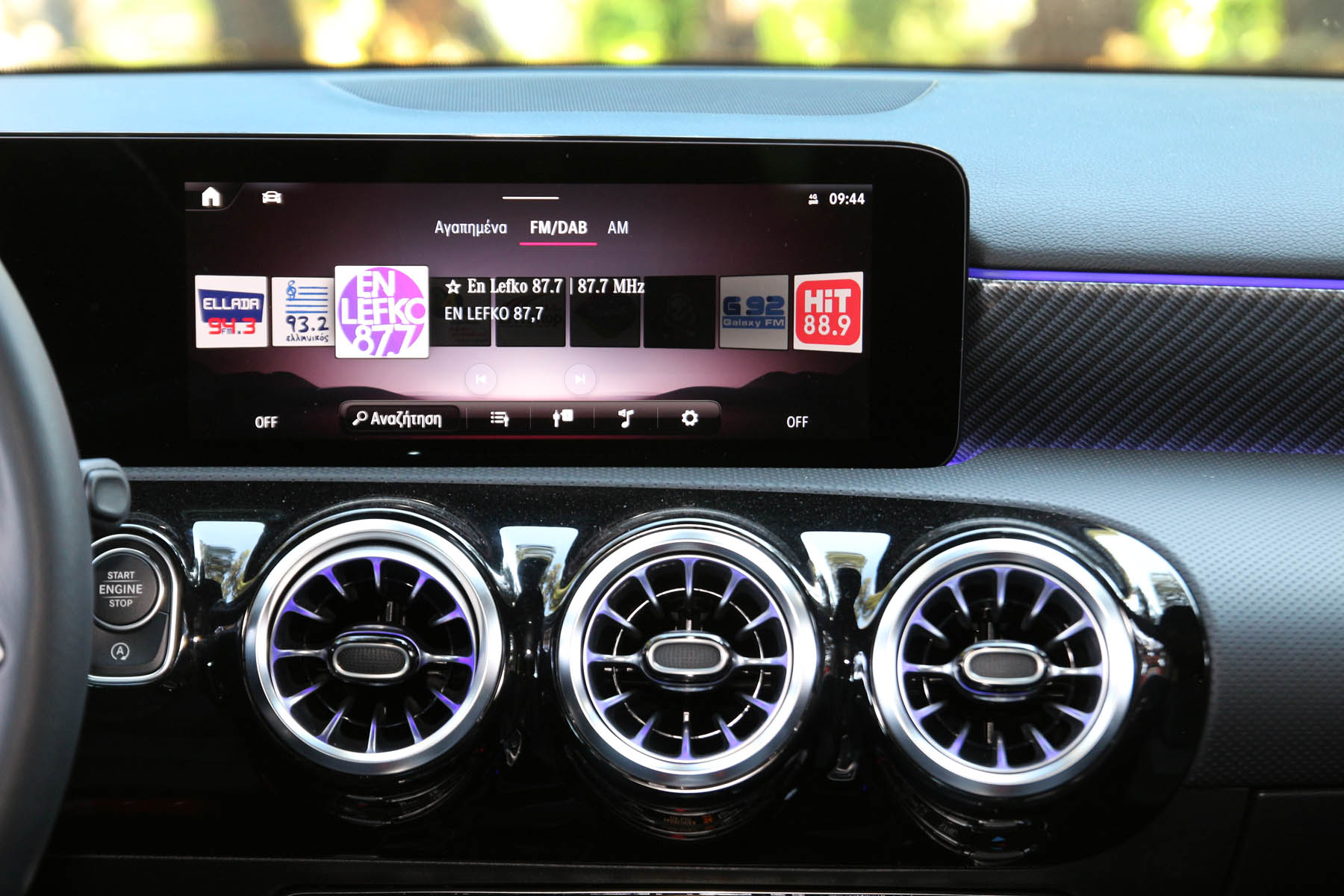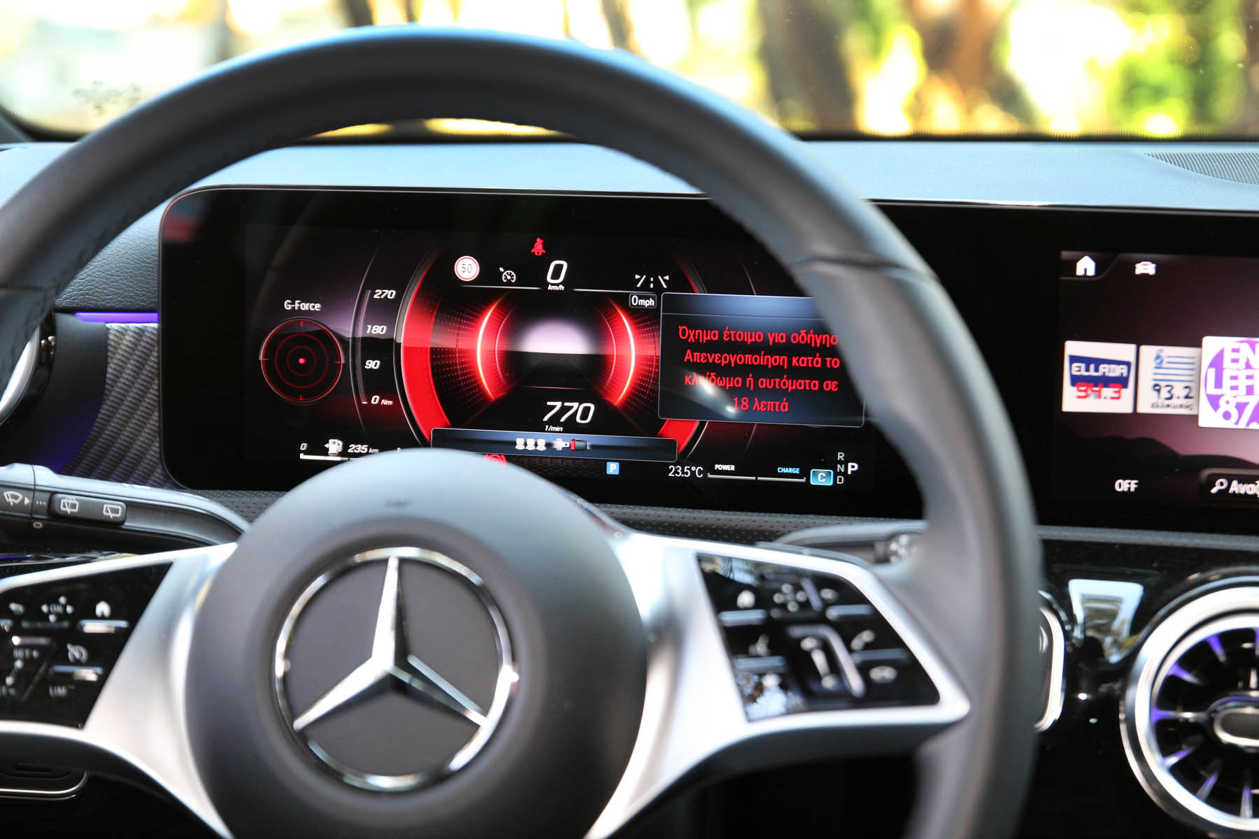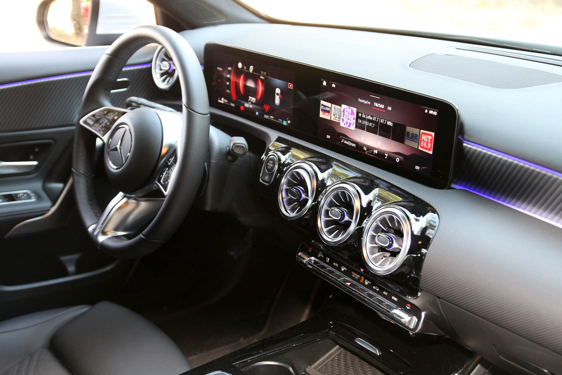 Ένα παράδειγμα είναι οι δύο ψηφιακές οθόνες 10,25 ιντσών του συστήματος MBUX (σχεδιασμένες σαν μία ενιαία επιφάνεια), με αυτήν του multimedia να ελέγχεται πλέον μόνο μέσω άμεσης αφής ή μέσω του τιμονιού.