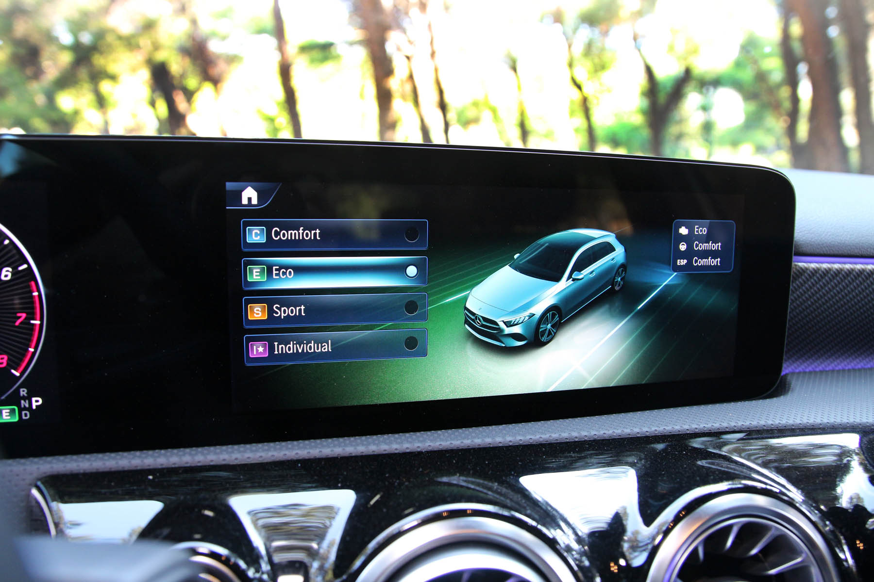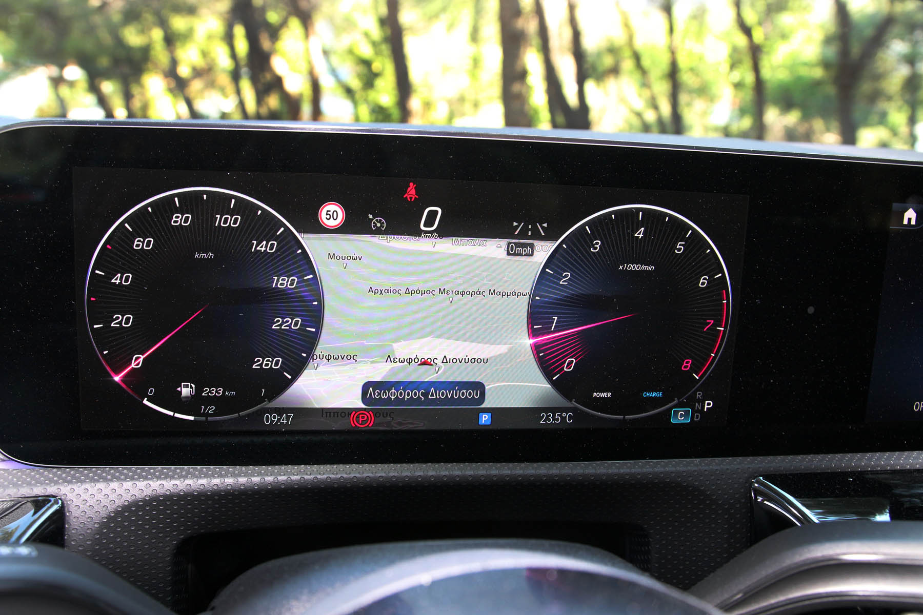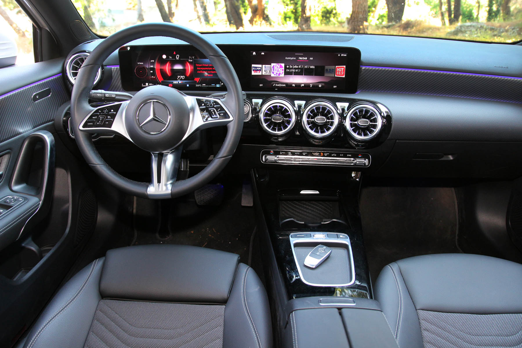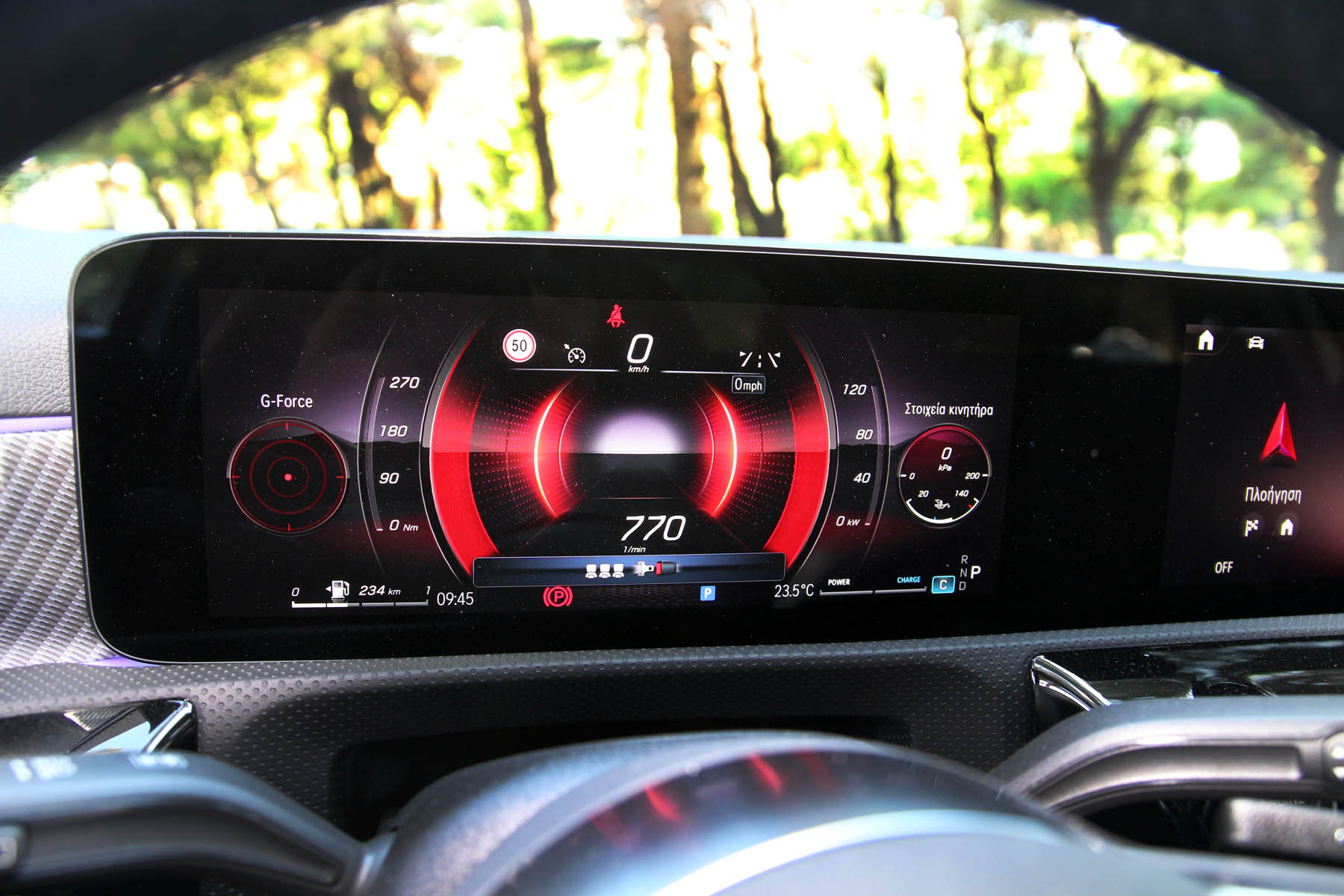 Ένα παράδειγμα είναι οι δύο ψηφιακές οθόνες 10,25 ιντσών του συστήματος MBUX (σχεδιασμένες σαν μία ενιαία επιφάνεια), με αυτήν του multimedia να ελέγχεται πλέον μόνο μέσω άμεσης αφής ή μέσω του τιμονιού.