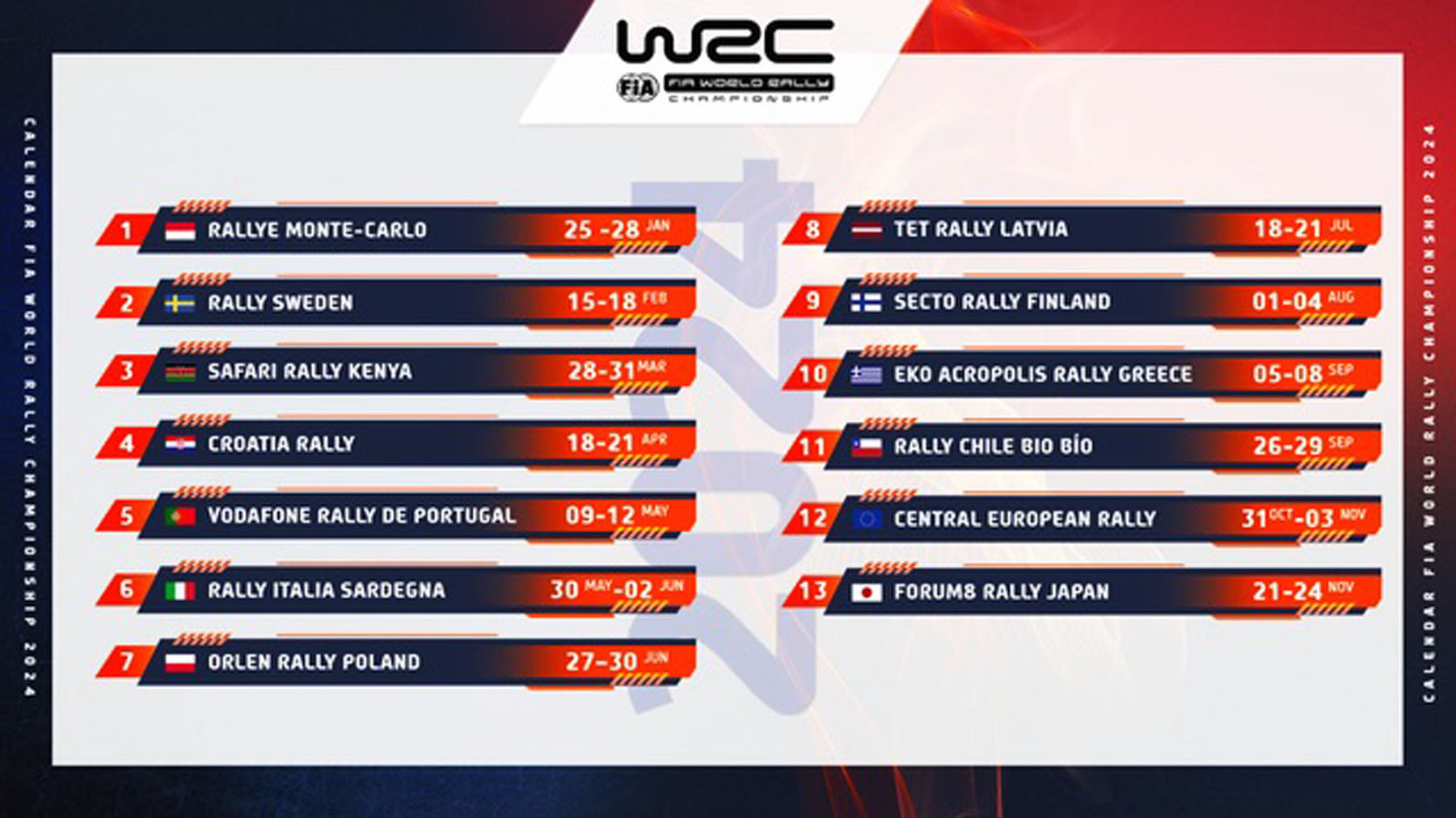 Το ημερολόγιο, που οριστικοποιήθηκε έπειτα από συνεδρίαση του Παγκόσμιου Συμβουλίου της FIA, θα περιλαμβάνει και το 2024 δεκατρείς αγώνες, με τους κλασικούς να πλαισιώνονται και από νέες εισόδους στο Πρωτάθλημα. Σημαντικότερες προσθήκες είναι αυτές του Ράλλυ Πολωνίας και του Ράλλυ Λετονίας, ενώ εκτός μένουν Μεξικό και Εσθονία.
