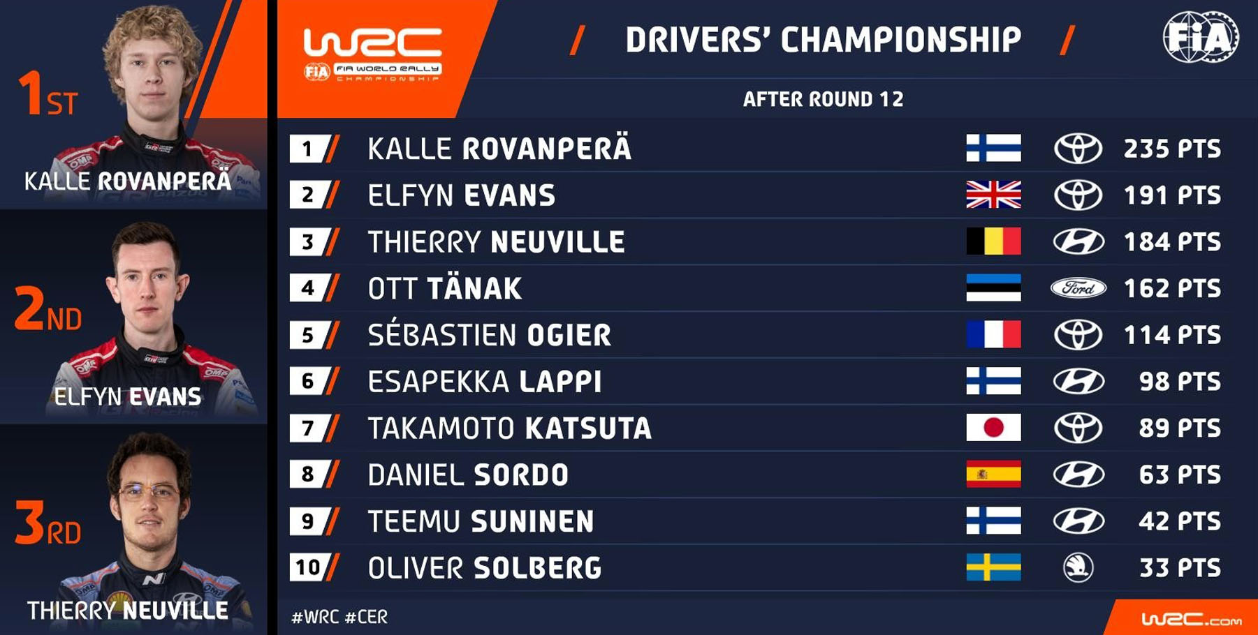 Ο Rovanpera, ενημερωμένος για το ατύχημα του Evans, κινήθηκε προσεκτικά επιτρέποντας στον Neuville να πάρει το προβάδισμα. Με τον τίτλο σχεδόν στα χέρια του, ο Rovanpera δεν πίεσε πολύ, αν και κατάφερε να κερδίσει τη ειδική 14.