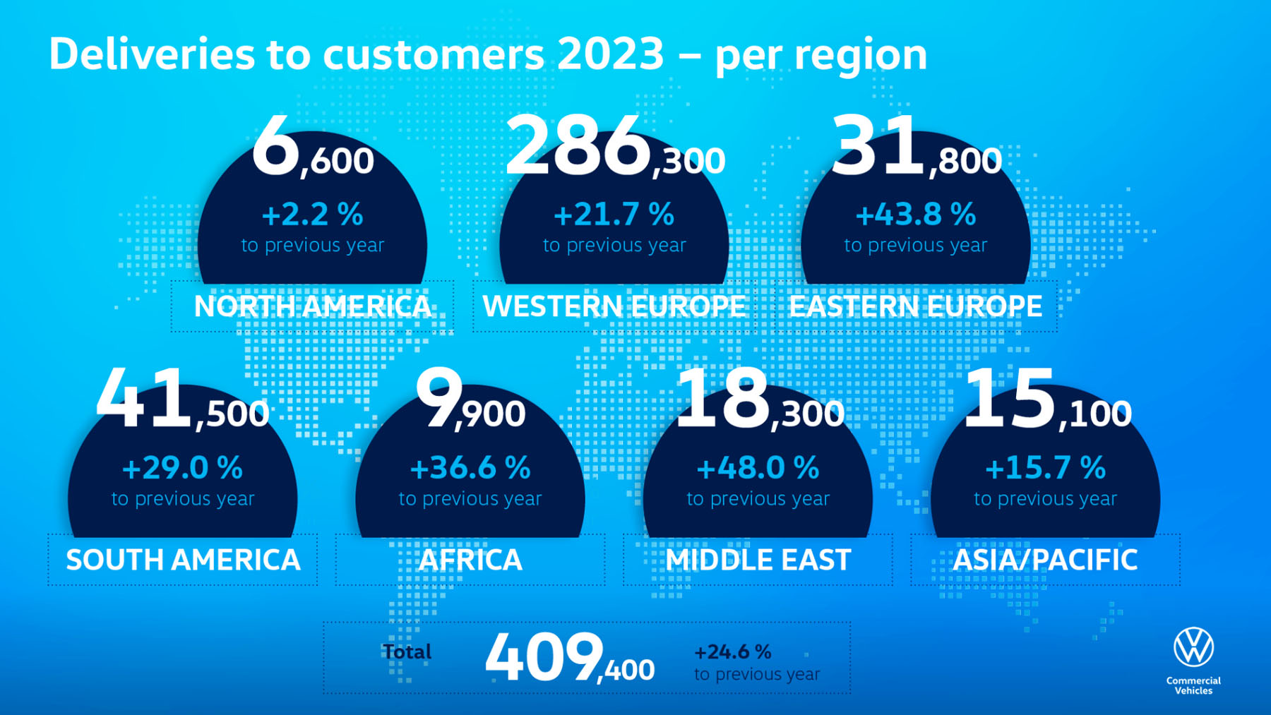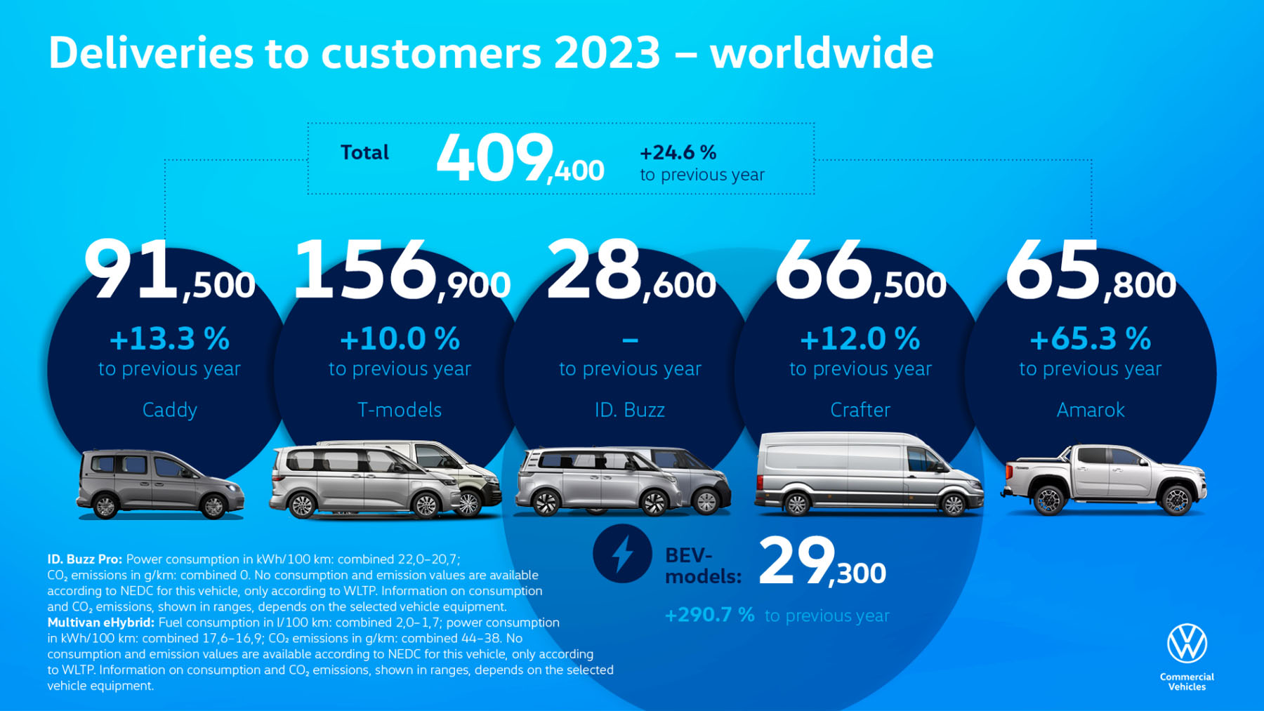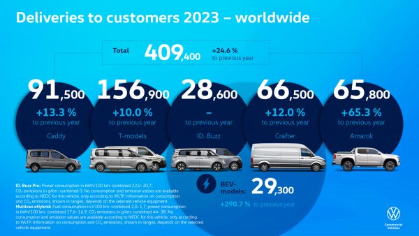 Σε σχέση με το προηγούμενο έτος όλες οι παγκόσμιες αγορές στις οποίες δραστηριοποιείται η VWCV παρουσίασαν αξιοσημείωτη, κατά κανόνα διψήφια, αύξηση των παραδόσεων. Η αύξηση αυτή αφορά όλα τα μοντέλα. Χάρη στη συνεχή αύξηση των παραδόσεων του αμιγώς ηλεκτρικού ID. Buzz κατά τη διάρκεια του έτους, ο αριθμός των ηλεκτρικών μοντέλων που παραδόθηκαν σχεδόν τετραπλασιάστηκε: από τις 7.500 μονάδες που ήταν το 2022, στις 29.300 για το 2023, ενώ και το μερίδιο των ηλεκτρικών οχημάτων που πωλήθηκαν από την VWCV ανήλθε σε 7,1%.