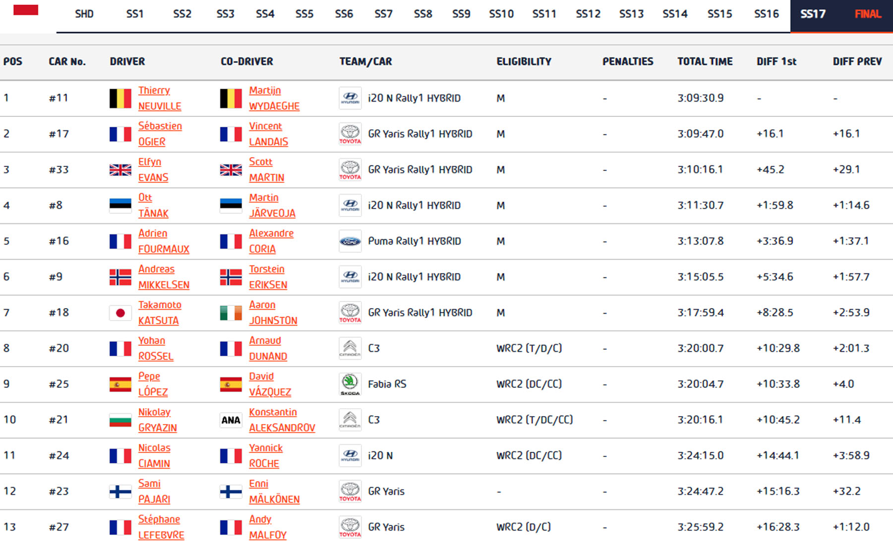 Ο θρίαμβος του Neuville ήταν ακόμη πιο εντυπωσιακός καθώς αντιμετώπισε τον εννέα φορές νικητή του Μόντε Κάρλο, Ogier, τερματίζοντας με μια αξιοσημείωτη διαφορά 16,1 δευτερολέπτων.