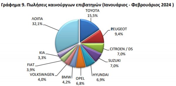 Αναφορικά με τις μάρκες που επέλεξαν οι Έλληνες στο δίμηνο, για μια ακόμη φορά η Toyota πρωταγωνιστεί με μερίδιο αγοράς 15,5%, με την Peugeot να ακολουθεί με μερίδιο αγοράς 9,4%.
