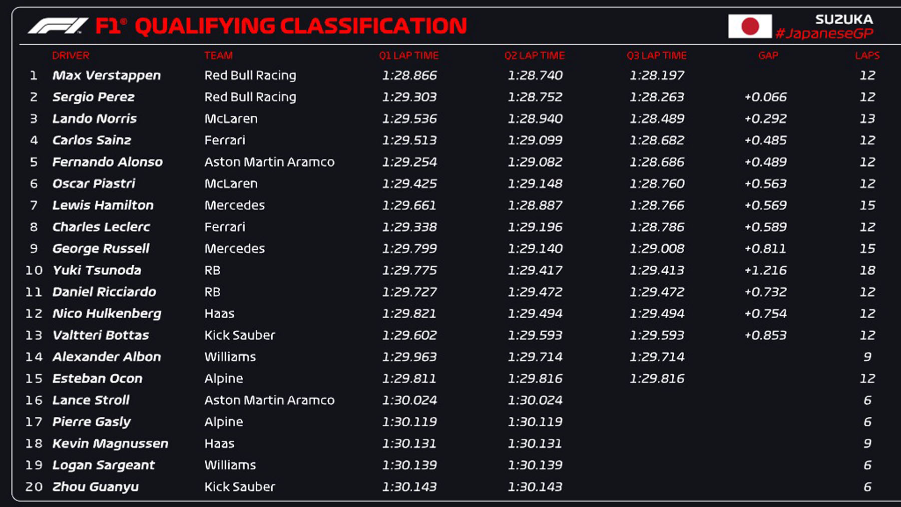 Ο Max Verstappen έδειξε ποιος είναι ο κυρίαρχος και στην πίστα της Suzuka κατακτώντας την pole position για τη Red Bull Racing, ξεπερνώντας οριακά τον team mate του Sergio Perez για μόλις 0,06 δευτερόλεπτα. Ο Lando Norris της McLaren εξασφάλισε την 3η θέση στο grid.