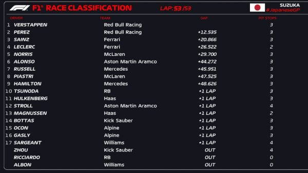 Ο Max Verstappen έκανε μία άνετη εμφάνιση στο Grand Prix της Ιαπωνίας, εξασφαλίζοντας μια επιβλητική νίκη για τη Red Bull Racing σε ένα «1-2» με τον ομόσταυλό του Sergio Perez. Ο αγώνας είχε από πρώιμο δράμα, όταν μια σύγκρουση μεταξύ του Daniel Ricciardo και του Alex Albon οδήγησε σε κόκκινη σημαία, διακόπτοντας προσωρινά τη διαδικασία.