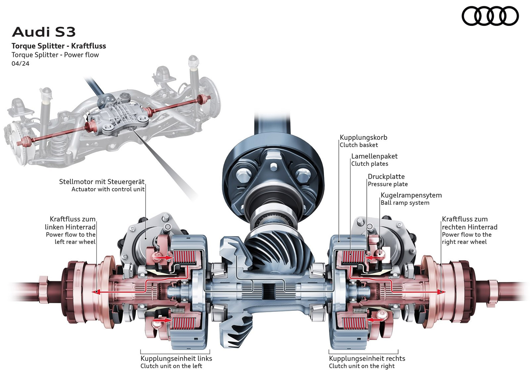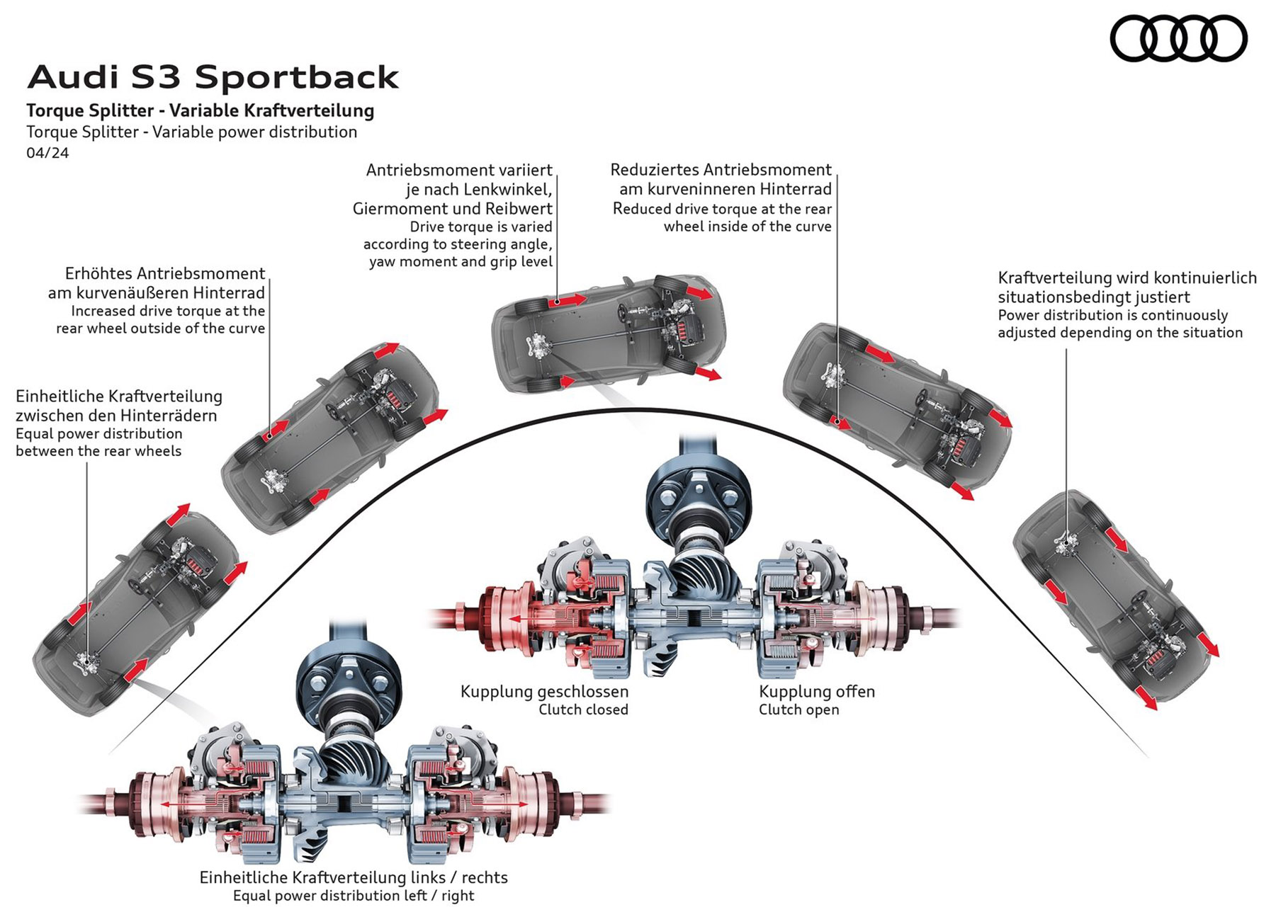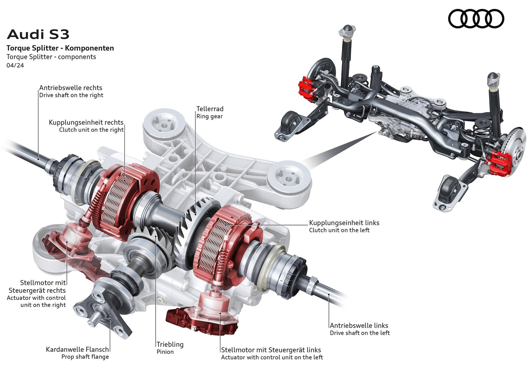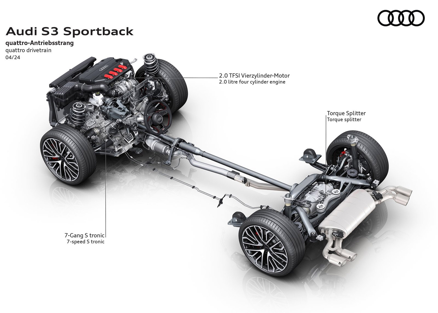 Εμπνευσμένο από το αδελφάκι του RS 3, το S3 ενσωματώνει έναν διαχωριστή ροπής (torque splitter με ένα πολύδισκο συμπλεκτάκι σε κάθε ημιαξόνιο) για ιδανική κατανομή της ροπής μεταξύ των πίσω τροχών, παρέχοντας βέλτιστη πρόσφυση και σπορ κράτημα.