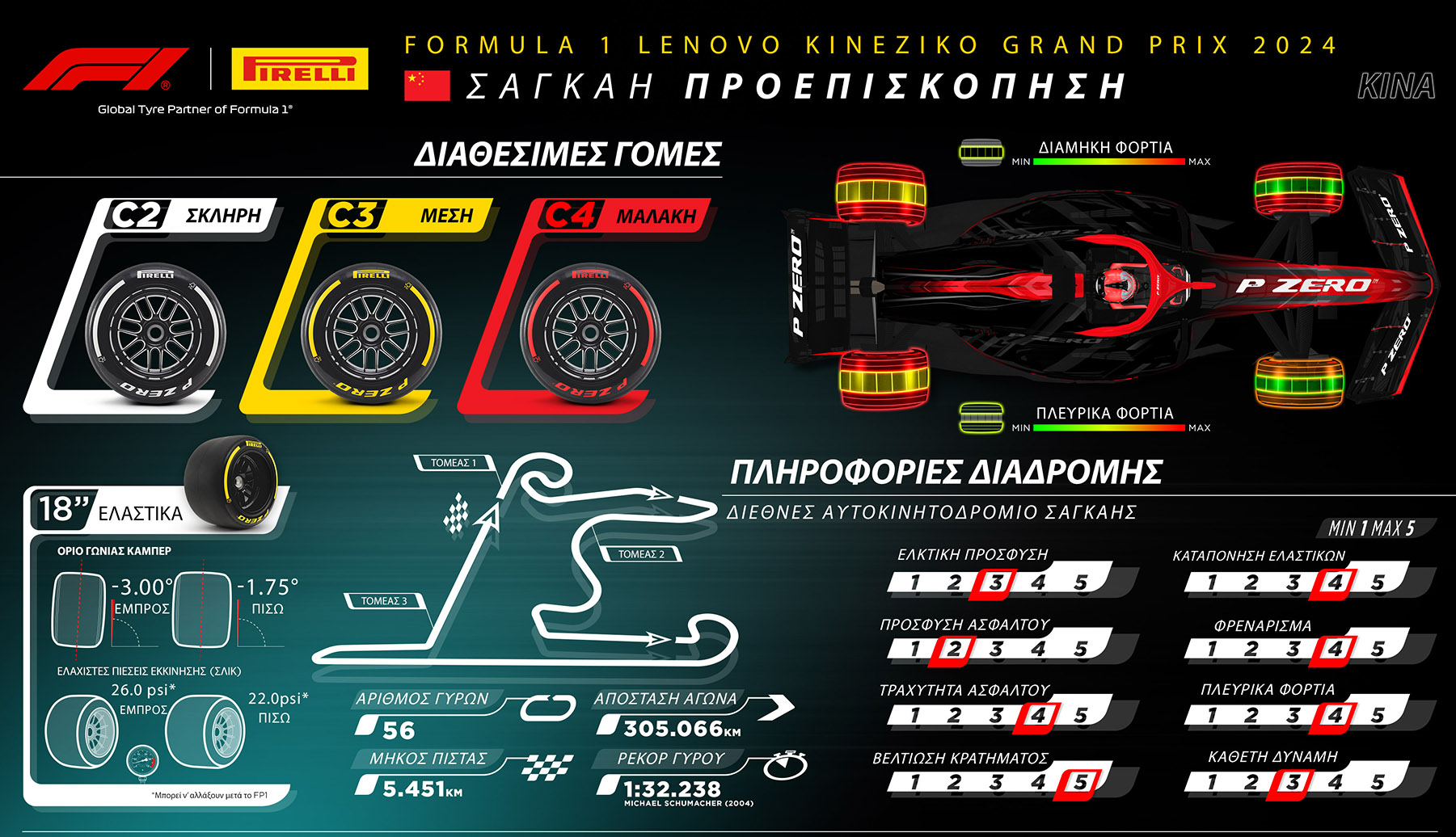 Με βάση προσομοιώσεις και προηγούμενα δεδομένα, τα ελαστικά υπόκεινται σε πλευρικές και διαμήκεις δυνάμεις μεσαίου επιπέδου. Τα αριστερά ελαστικά φθείρονται περισσότερο, λόγω της δεξιόστροφης φοράς. Η τριάδα των γομών που επιλέχθηκε για τη Σαγκάη, είναι οι μεσαίες γόμες της γκάμας: η C2 γόμα θα είναι η σκληρή, η C3 γόμα θα είναι η μέση και η C4 γόμα θα είναι η μαλακή. Οδηγοί, ομάδες και μηχανικοί ξεκινούν από το μηδέν όσον αφορά στο σετάρισμα των μονοθέσιων.