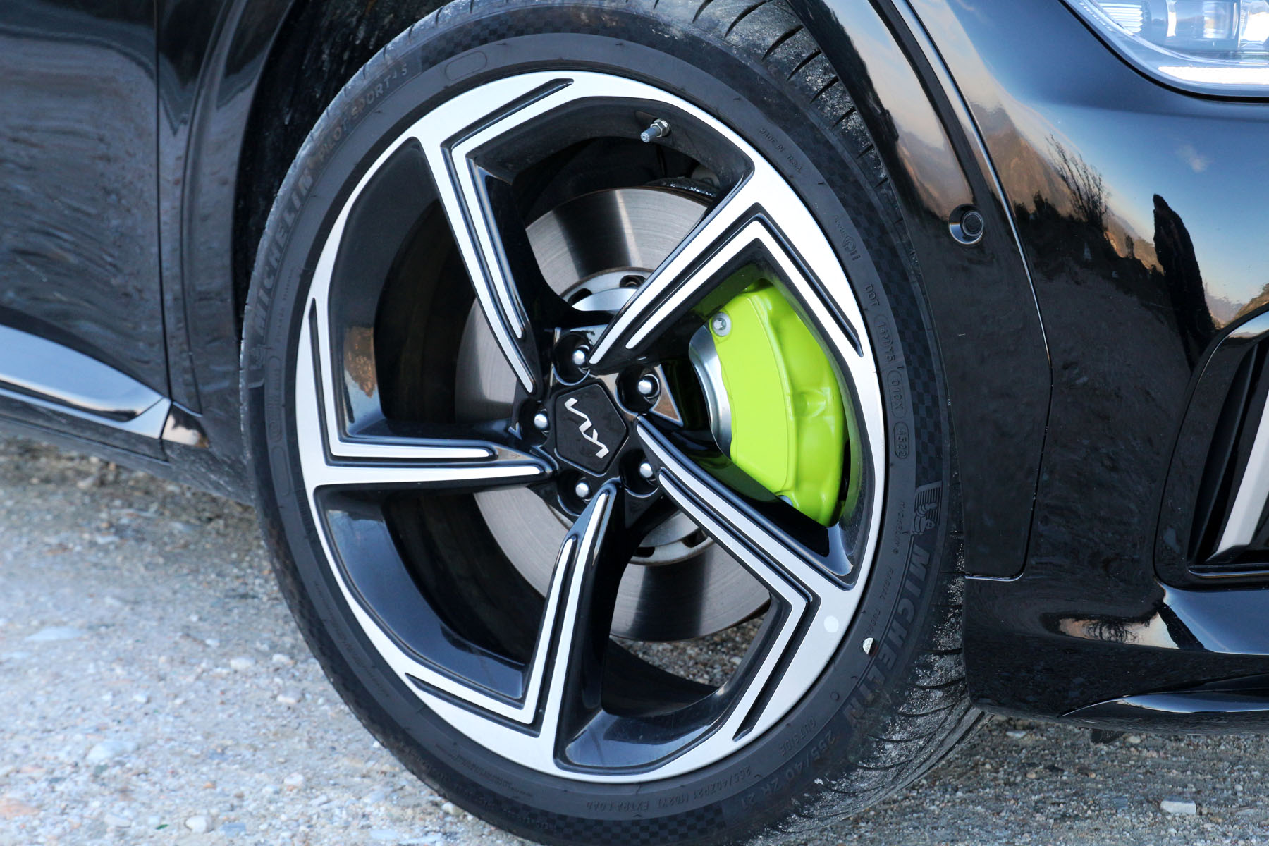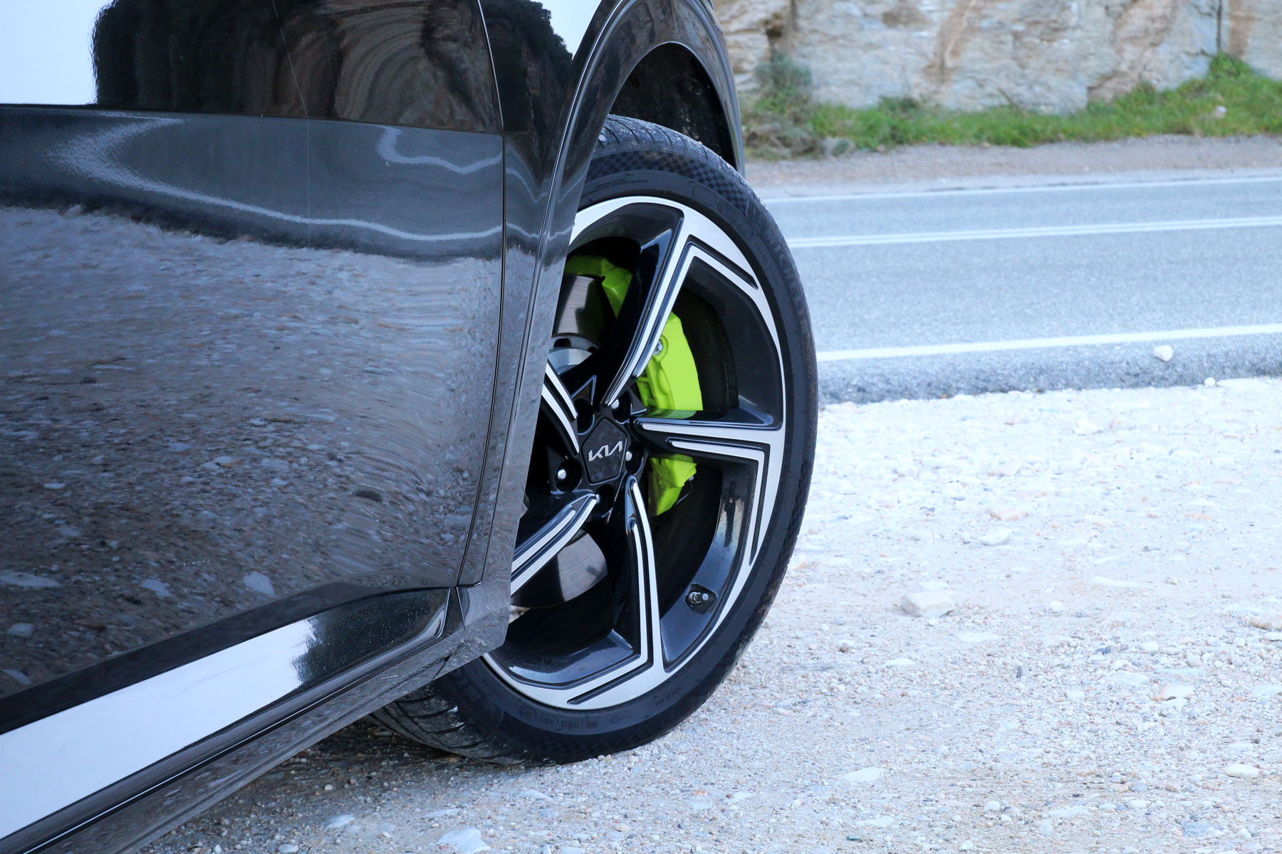 Το EV6 GT είναι επίσης ένα αθόρυβο ατίθασο άτι 585 ίππων, που δεν βροντοφωνάζει για τις δεξιότητες του. Αρκείται στις πράσινες δαγκάνες, τις ζάντες 21 ιντσών και το 40άρι προφίλ ελαστικών.