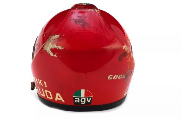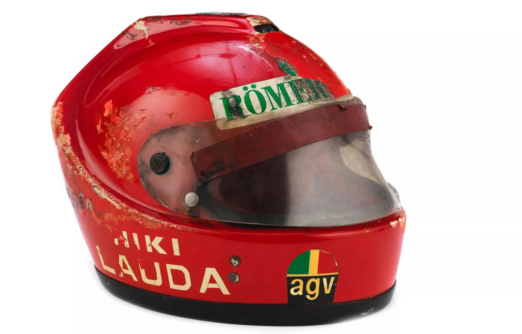 Το κράνος της AGV, που φέρει σημάδια από τη φωτιά, αποτελεί ένα συγκλονιστικό κομμάτι της ιστορίας του Lauda. Η δεξιά πλευρά του κράνους φέρει σοβαρές ζημιές, με σπασμένο κόκκινο χρώμα και εν μέρει ξεφλουδισμένα γράμματα «Niki Lauda».