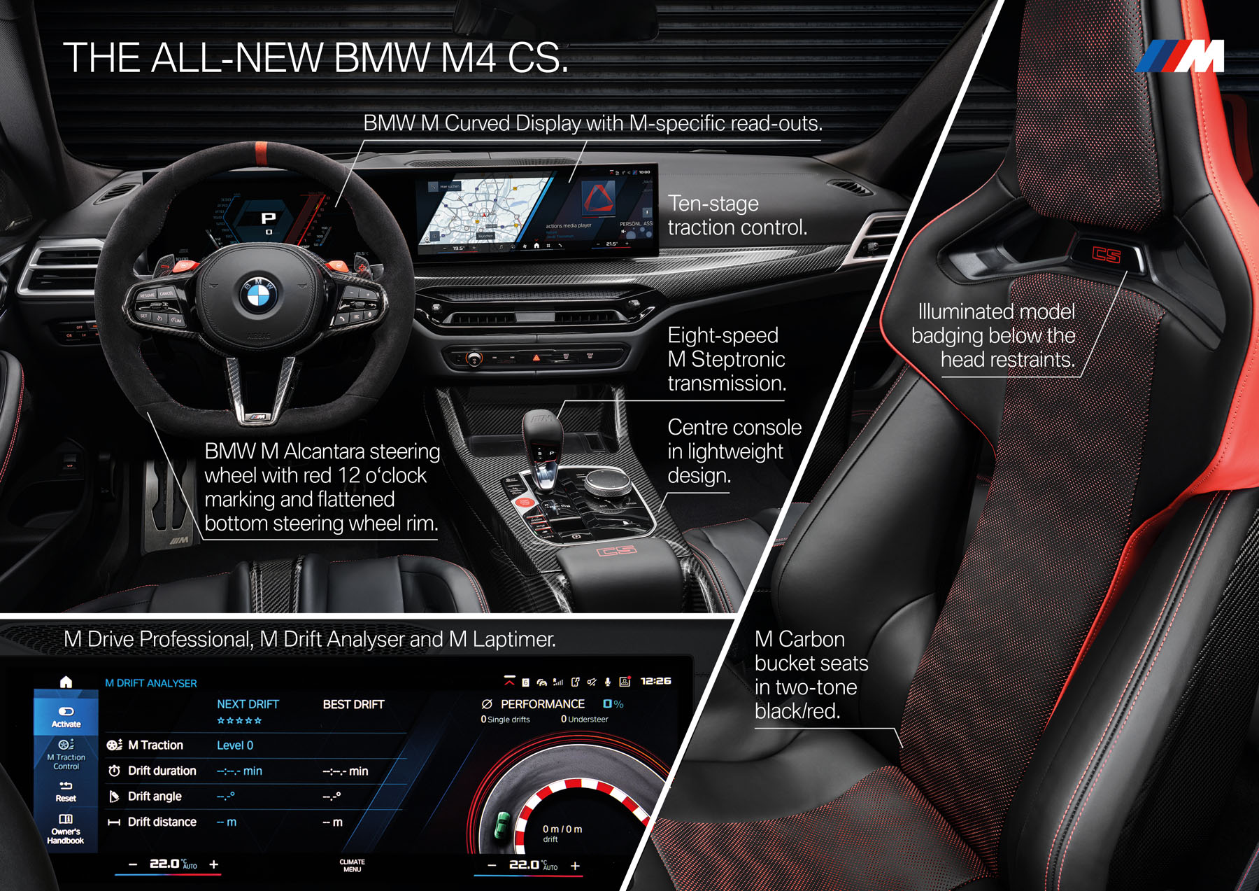 Στο βασικό εξοπλισμό της νέας M4 CS υπάρχει το σύστημα M Drive Professional, το οποίο περιλαμβάνει λειτουργίες βελτιστοποιημένες για την πίστα, όπως το M Drift Analyser και το M Laptimer, ενώ το M Traction Control προσφέρει 10 διαβαθμίσεις των ηλεκτρονικών ευστάθειας.
