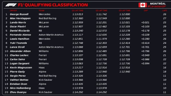 «Νιώθω τόσο ωραία, τόση σκληρή δουλειά έχει γίνει πίσω στο εργοστάσιο. Είπαμε στο Μονακό ότι ελπίζαμε ότι αυτό ήταν η αρχή της σεζόν», είπε ο Russell. «Είναι φανταστικό όταν ερχόμαστε στο Μόντρεαλ. Το πρώτο μέρος έγινε, τώρα πρέπει να παλέψουμε για τη νίκη».